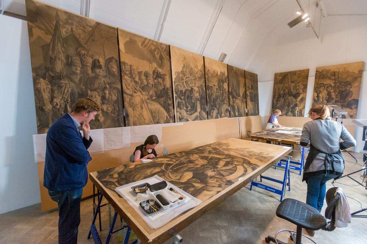Conservators working on Daniel Maclise’s “The Waterloo Cartoon” (1858) (photo © Benedict Johnson, courtesy Royal Academy of Arts) (click to enlarge)