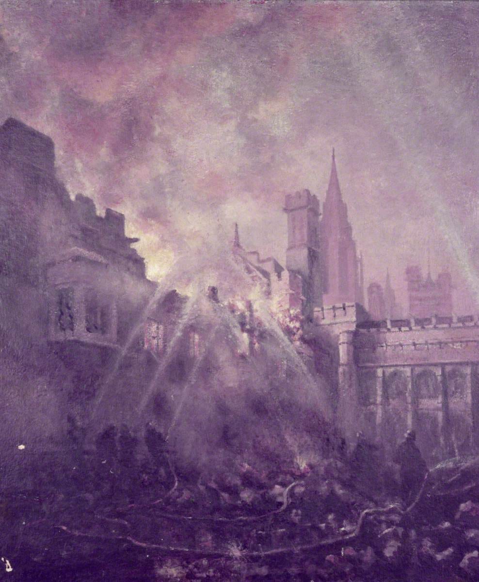224 works of art in the British Parliamentary collection have gone missing, including William John MacLeod, “Houses of Parliament, Burning of the Debating Chamber from Star Chamber Court” (1941) (posted below). The collection has accumulated over 9,000 works since 1841, the majority on view at the Westminster estate. Authorities from the House have blamed database errors for the unaccounted-for paintings, illustrations, etchings, prints, and cartoons, but cannot be sure if the artwork has been stolen.