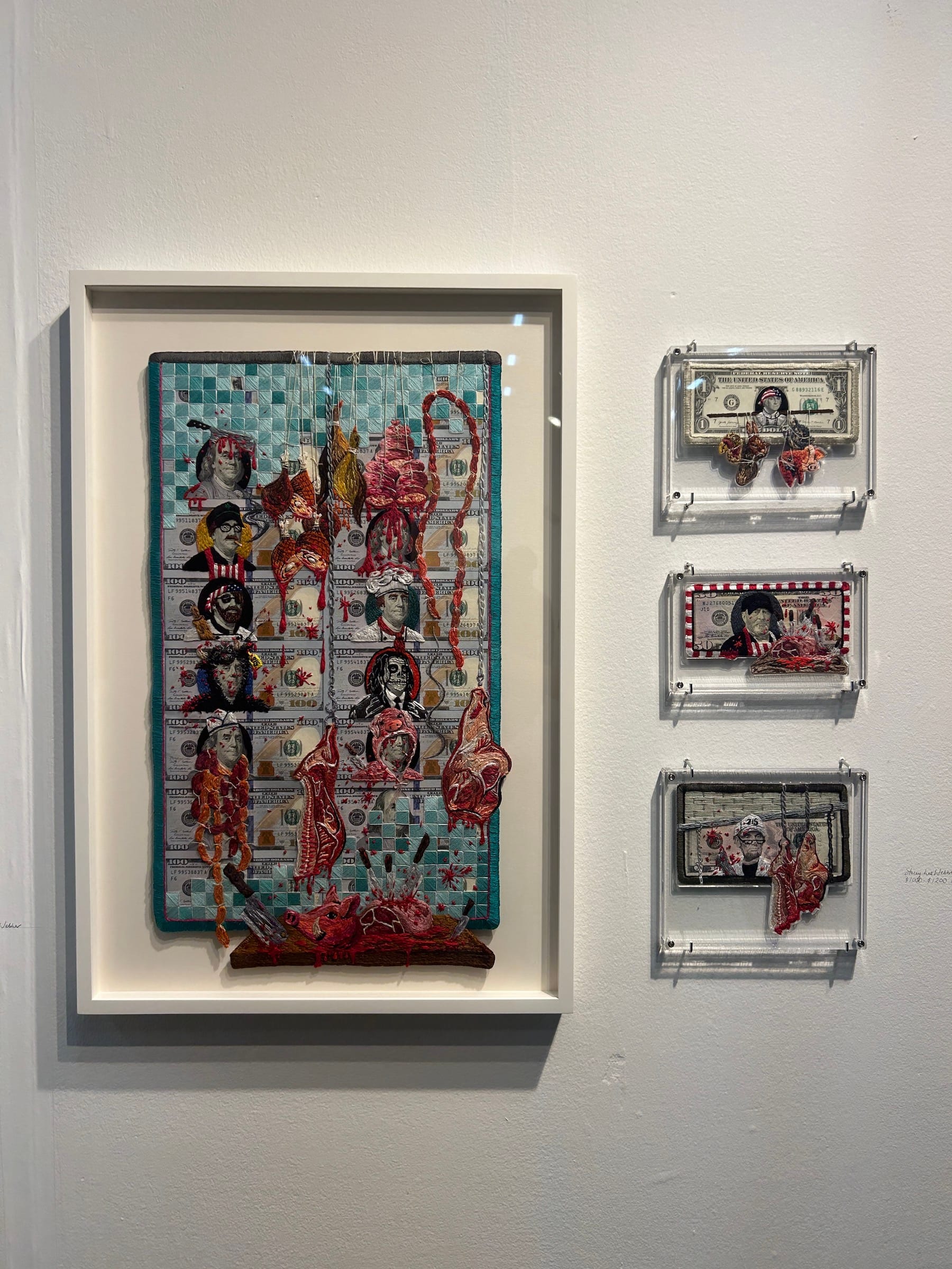 For its fifth year at the fair, the gallery displayed a selection of acrylic paintings by artists Morgan Sims, wall-hanging collages by Galen Gibson-Cornell, kaleidoscopic money prints by Marc Wagner, and Webber’s own work — paper bills hand-stitched together and embroidered with drippy visuals of bloody raw meat. It’s part of a project she has been working on for around four years, which involves transforming presidents’ heads into miniature portraits of blue-collar workers. Most recently, she has turned the project’s focus to butchers, which took on another, unintended significance in the wake of former President Donald Trump’s near assassination.