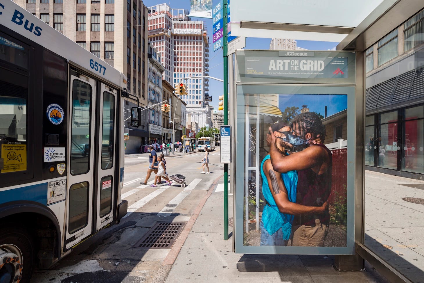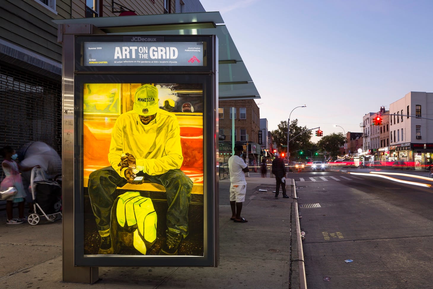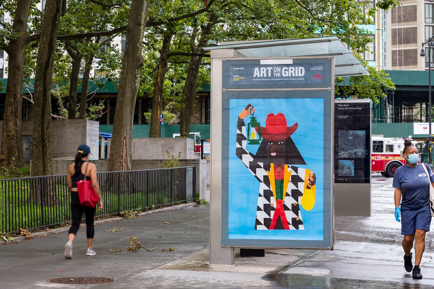 For the past few months, art, like everything else amid the pandemic, has largely had to be experienced outdoors. Fortunately, the Public Art Fund, always working in public space, was uniquely prepared for this moment. For their exhibition Art on the Grid, 50 artists created work reflecting on the pandemic, the ongoing protests against anti-Black racism, and themes of reconnection and renewal. The curators installed those works in over 500 bus shelters and 1,700 wifi kiosks around the five boroughs, transforming each display into a canvas.