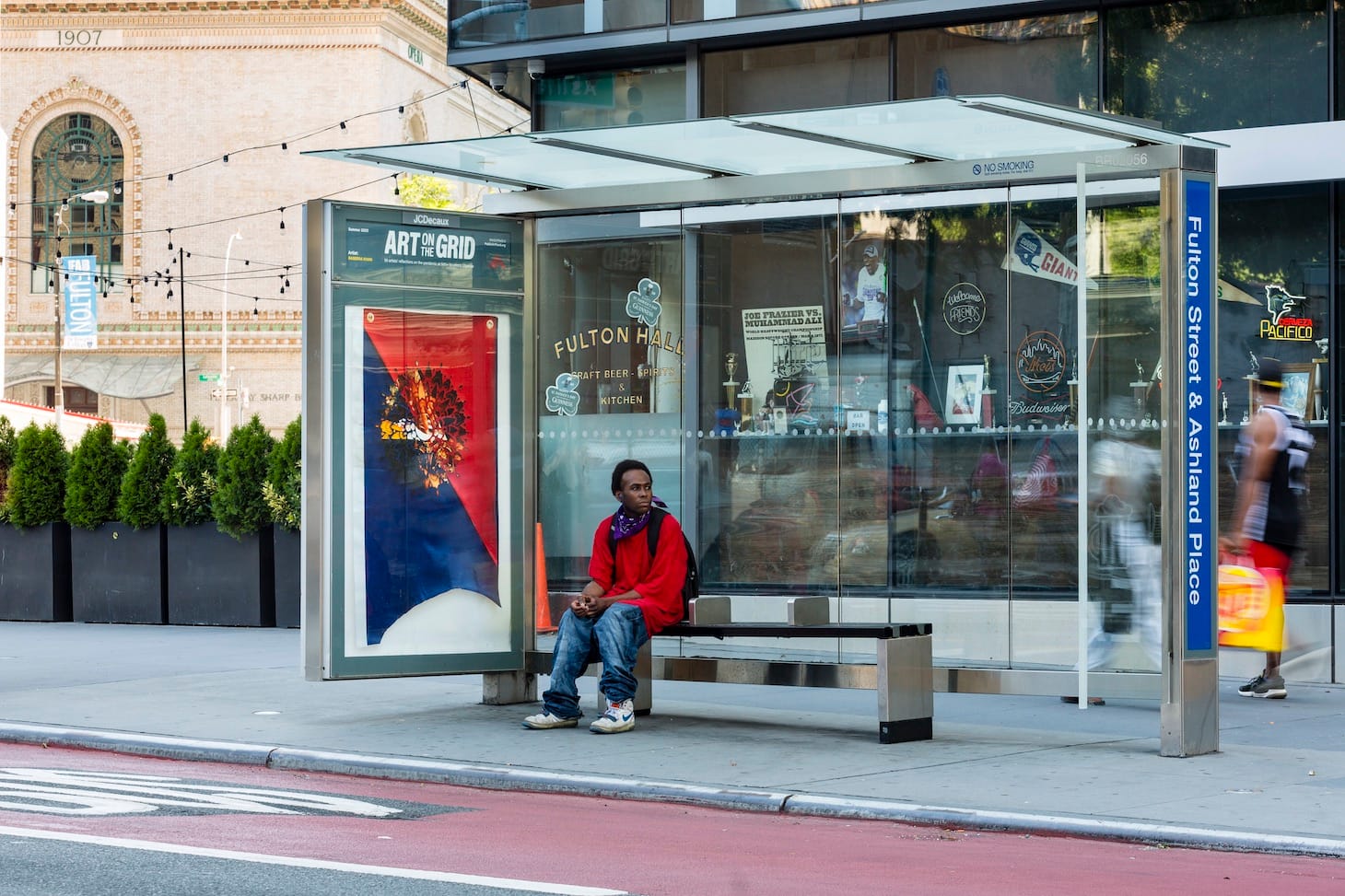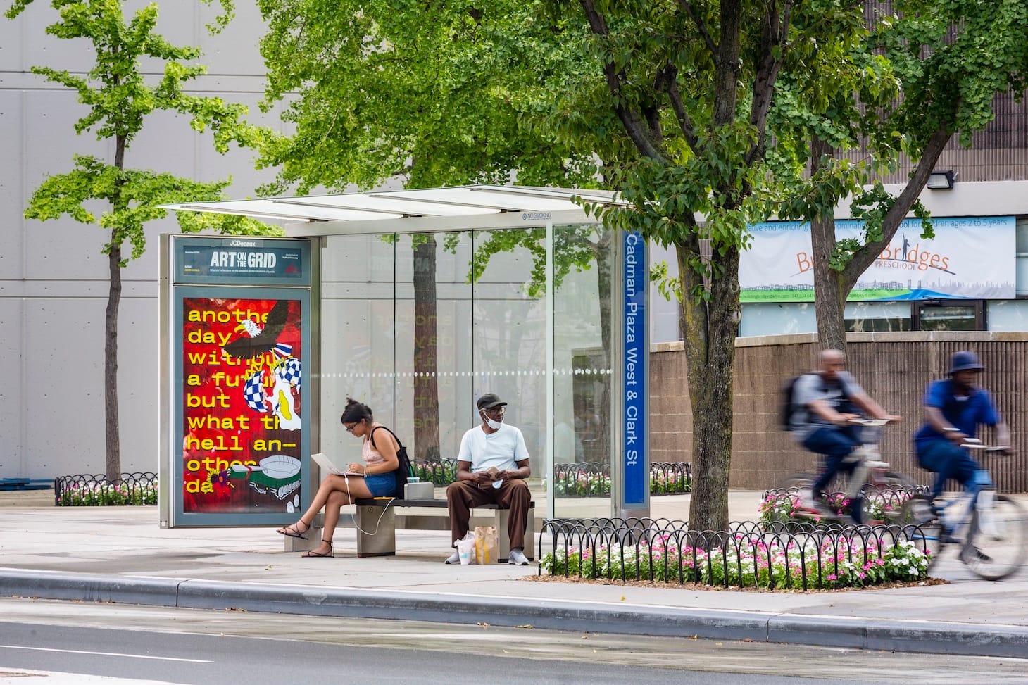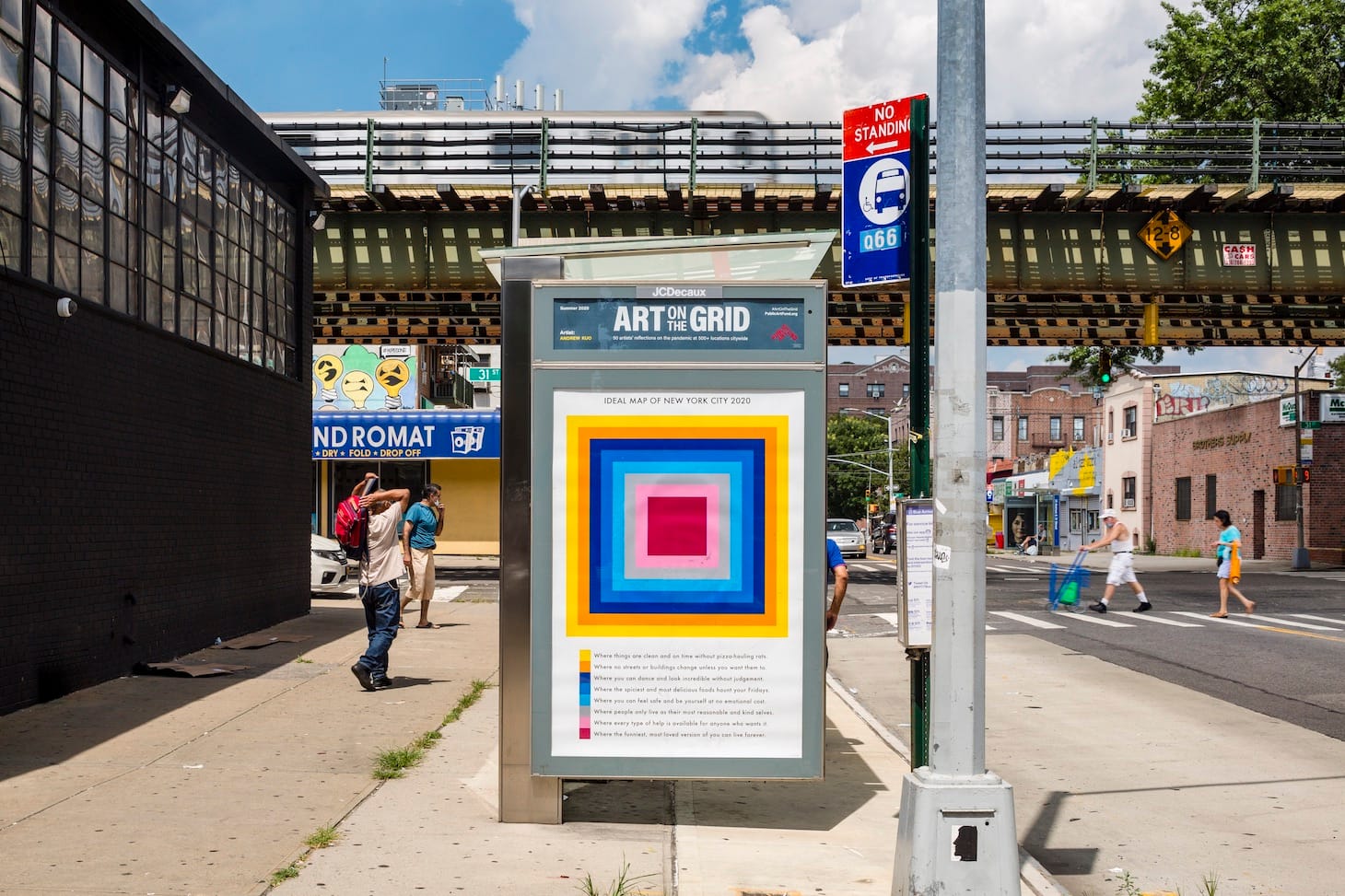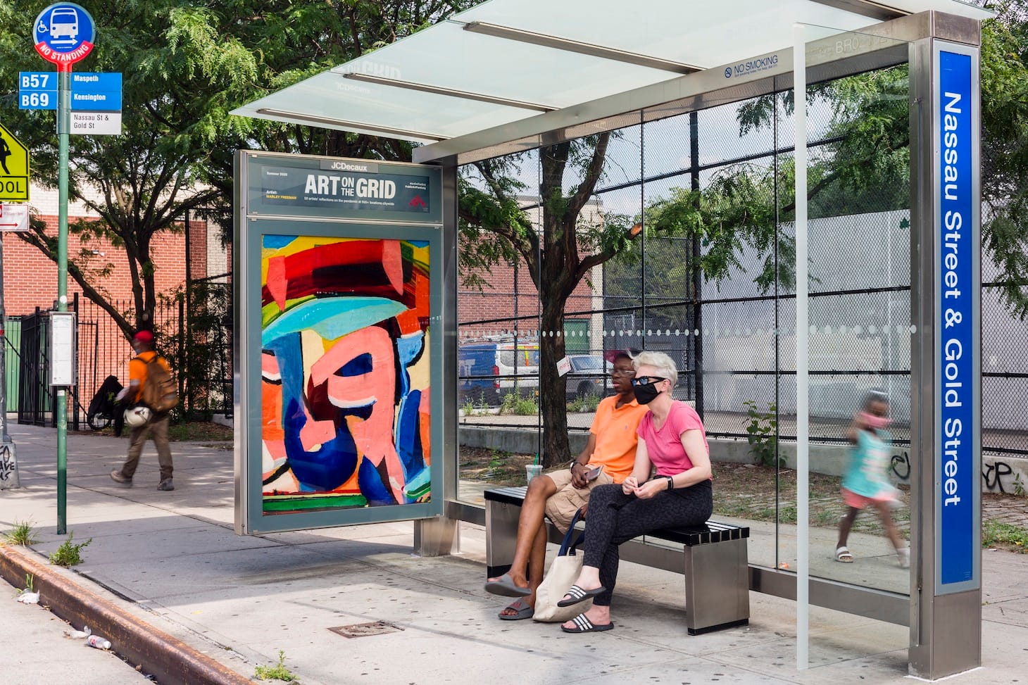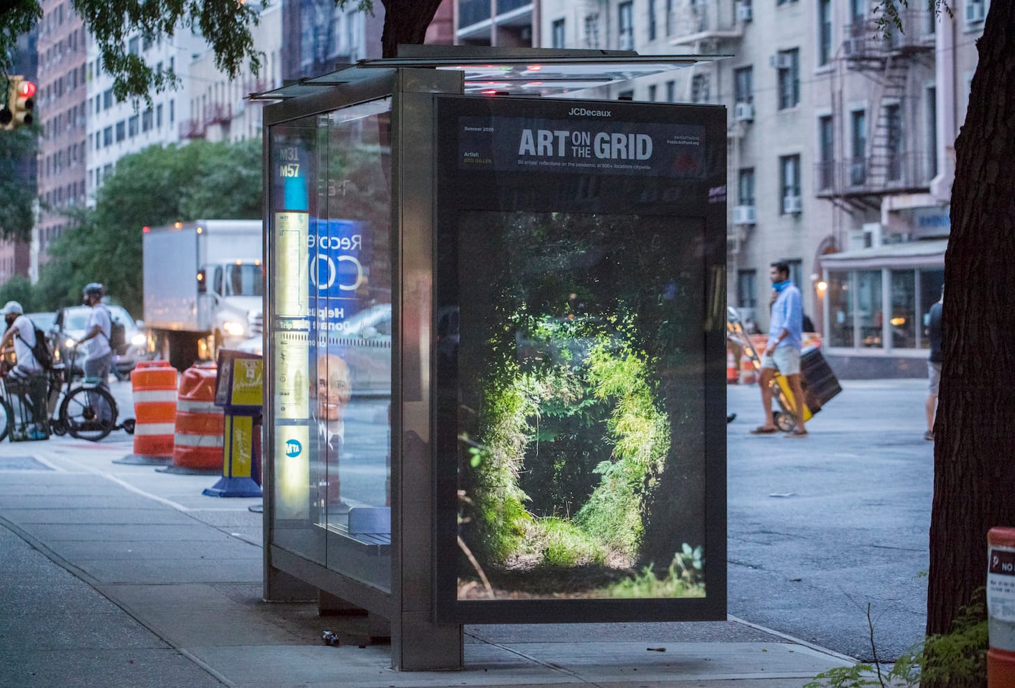 Installed in over 500 bus shelters and 1,700 wifi kiosks around the five boroughs, Art on the Grid softens, just a little, our long waits, for the bus, for the pandemic to be over.