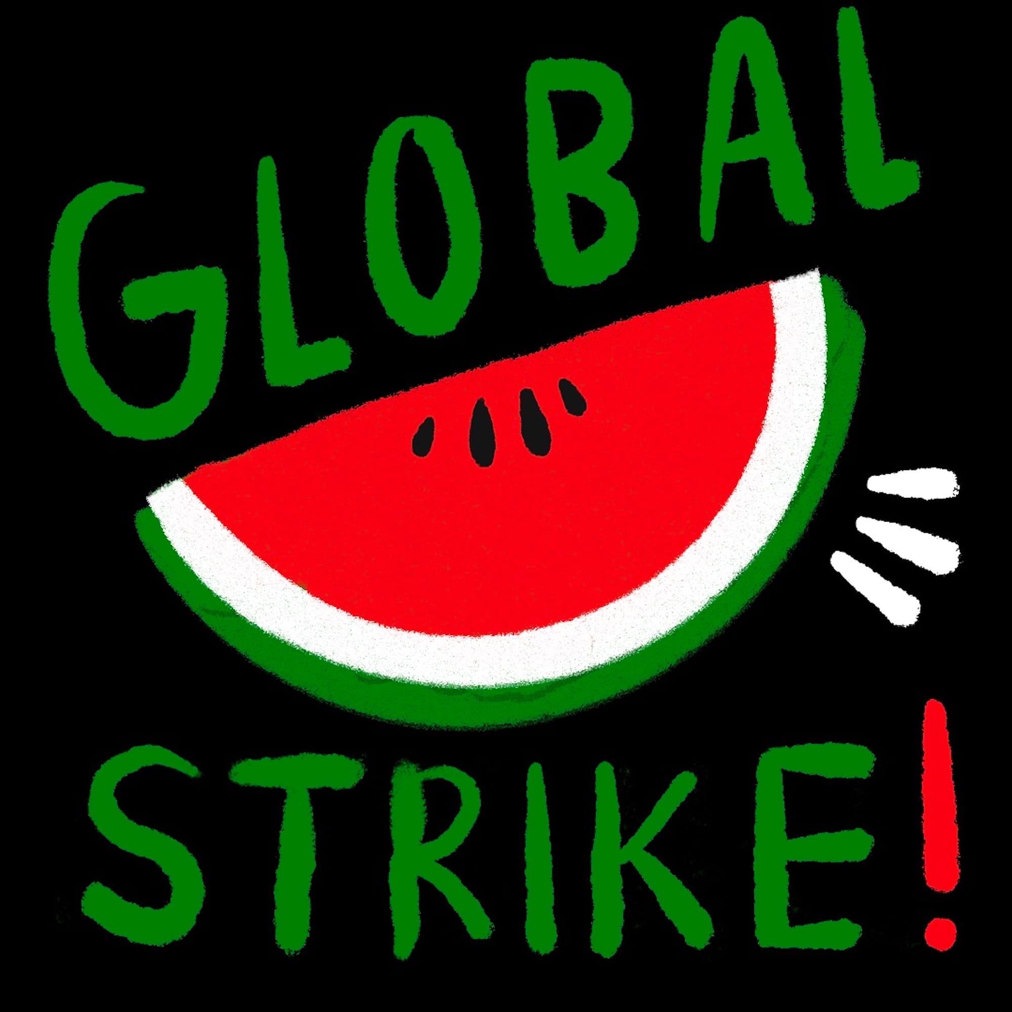 Participants in today's strike shared on social media an illustration of a watermelon, which has long been a symbol of Palestinian liberation. (illustration by Javie Huxley, courtesy The Mosaic Rooms)