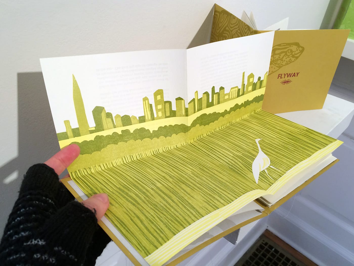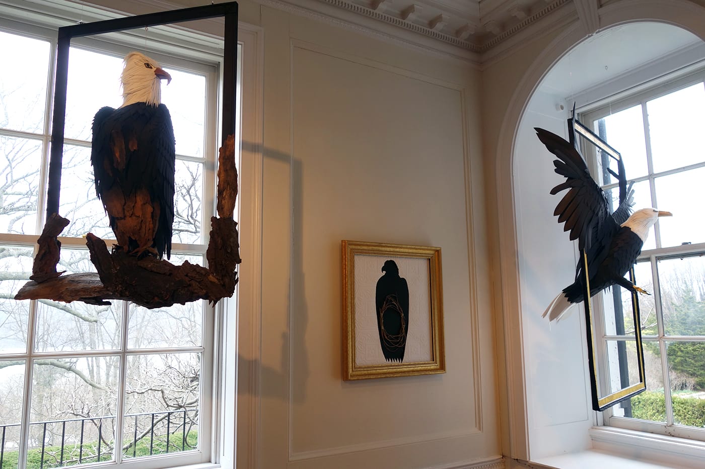 Sarah Nicholls similarly investigated nature close to home, creating artist books that act as field guides on urban wildlife, such as the shore birds and osprey of Jamaica Bay. One whole room is consumed by James Prosek’s wall painting, which has silhouettes of a blooming dogwood tree and spring birds, particularly warblers, in a style reminiscent of birding guidebooks. In the next space, Marna Chester’s sculptures of bald eagles are supported by frames made from compost and other natural material found at Wave Hill.