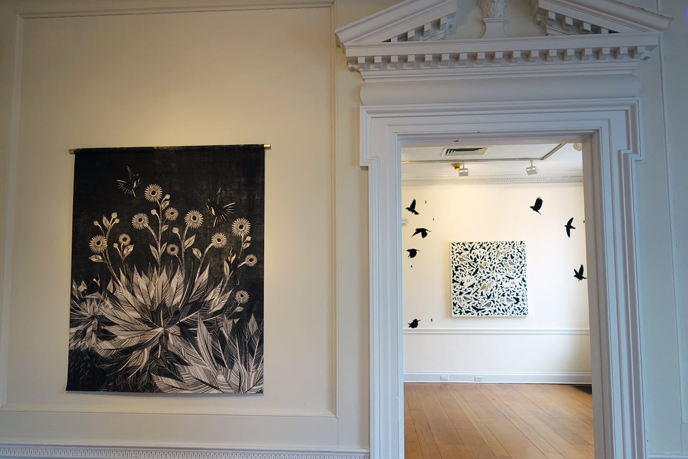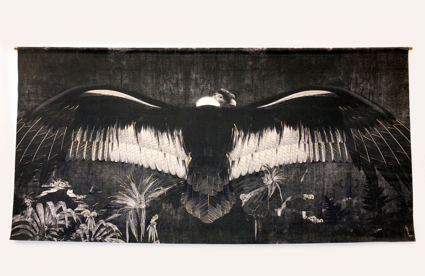 Step out from the gallery, and you’ll notice tropical birds perched in the bushes and trees. They’re part of Tatiana Arocha’s ongoing Perpetual Flight project. The digital painting series visualizes birds that are being thrown off their usual migration courses because of climate change, and it was sparked by the painted bunting that caused a stir when it appeared in Brooklyn’s Prospect Park in 2015, diverted from its historic migration path. As the birds return to New York City this spring, including lush escapes like Wave Hill, it’s worth taking a moment to observe their flight and habitats. Climate change and urban development impact the future of all species who call this area home, and recognizing and protecting the lives of birds can have implications beyond the avian world.