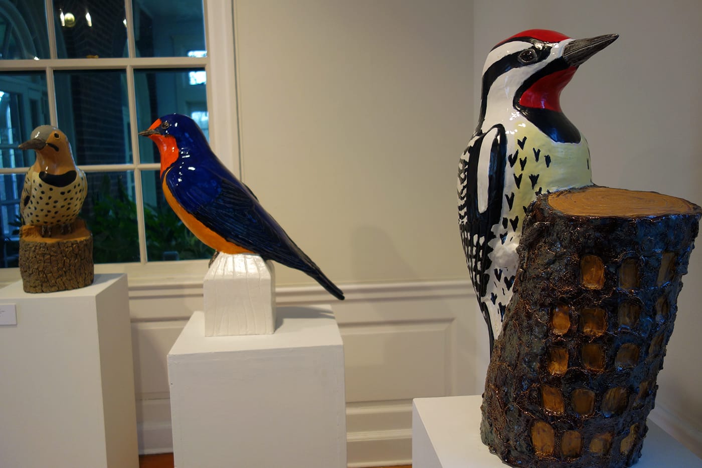 Willow, who is both an artist and a naturalist who leads birding tours at Wave Hill, served as an advisor for Avifauna. Organized by Jennifer McGregor, Eileen Jeng Lynch, and Natika Soward, the exhibition takes a broad view, from artists who are birders like Fred Tomaselli and Peter Morgan — the latter sculpts larger-than-life ceramics of his sightings — to a sound installation by Jenna Spevack. Birdsongs are powered by pinwheels outside one window, each representing a different local bird, whether the house finch or mourning dove, with the level of wind making its call either calm or a cacophony.