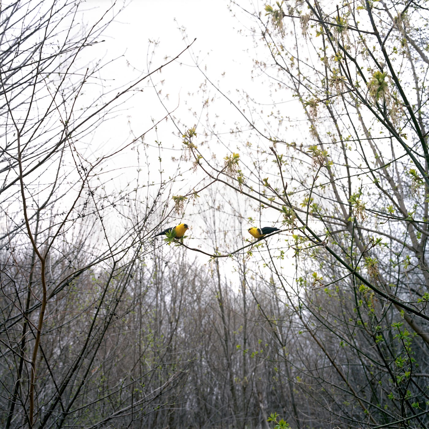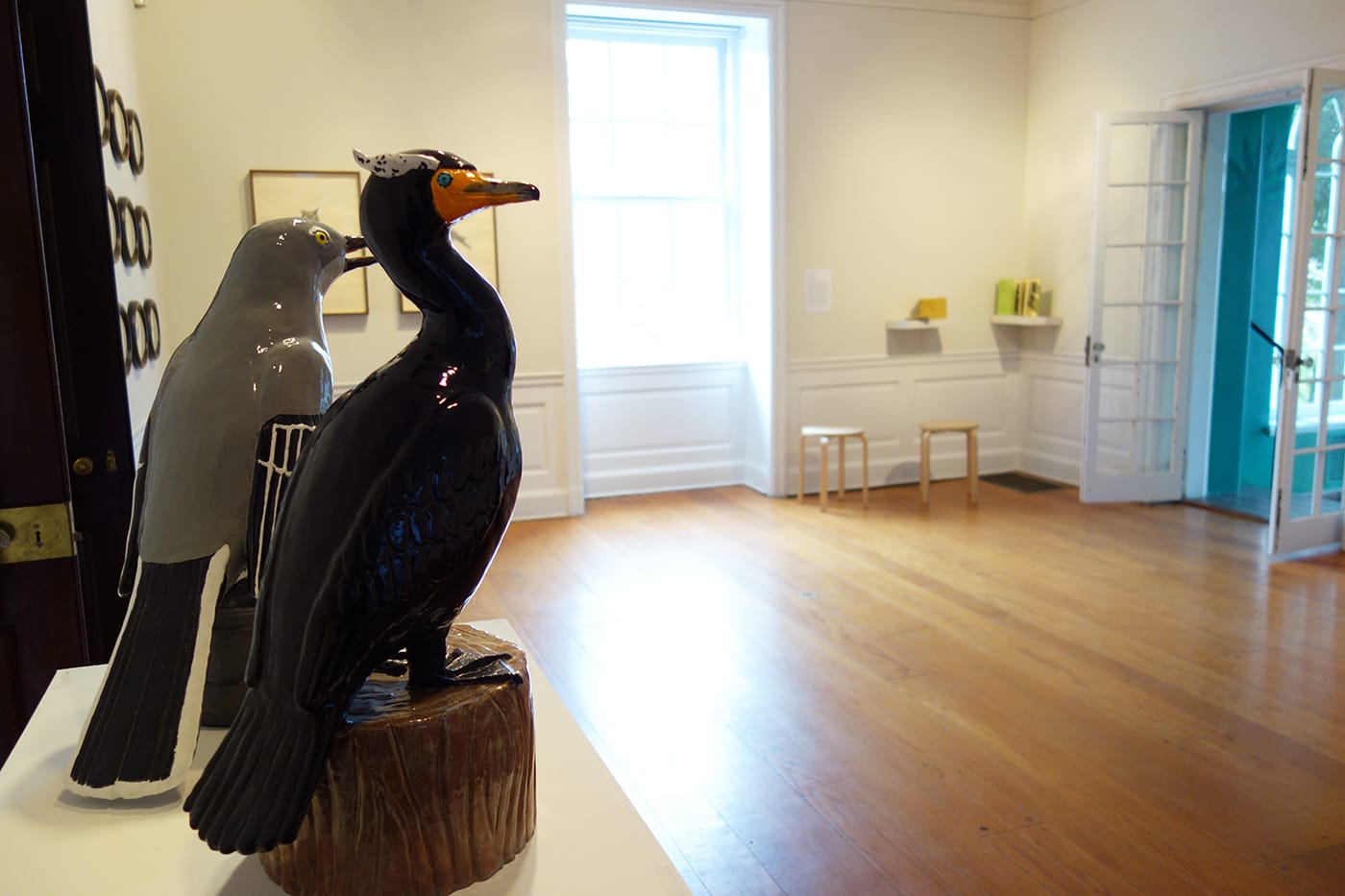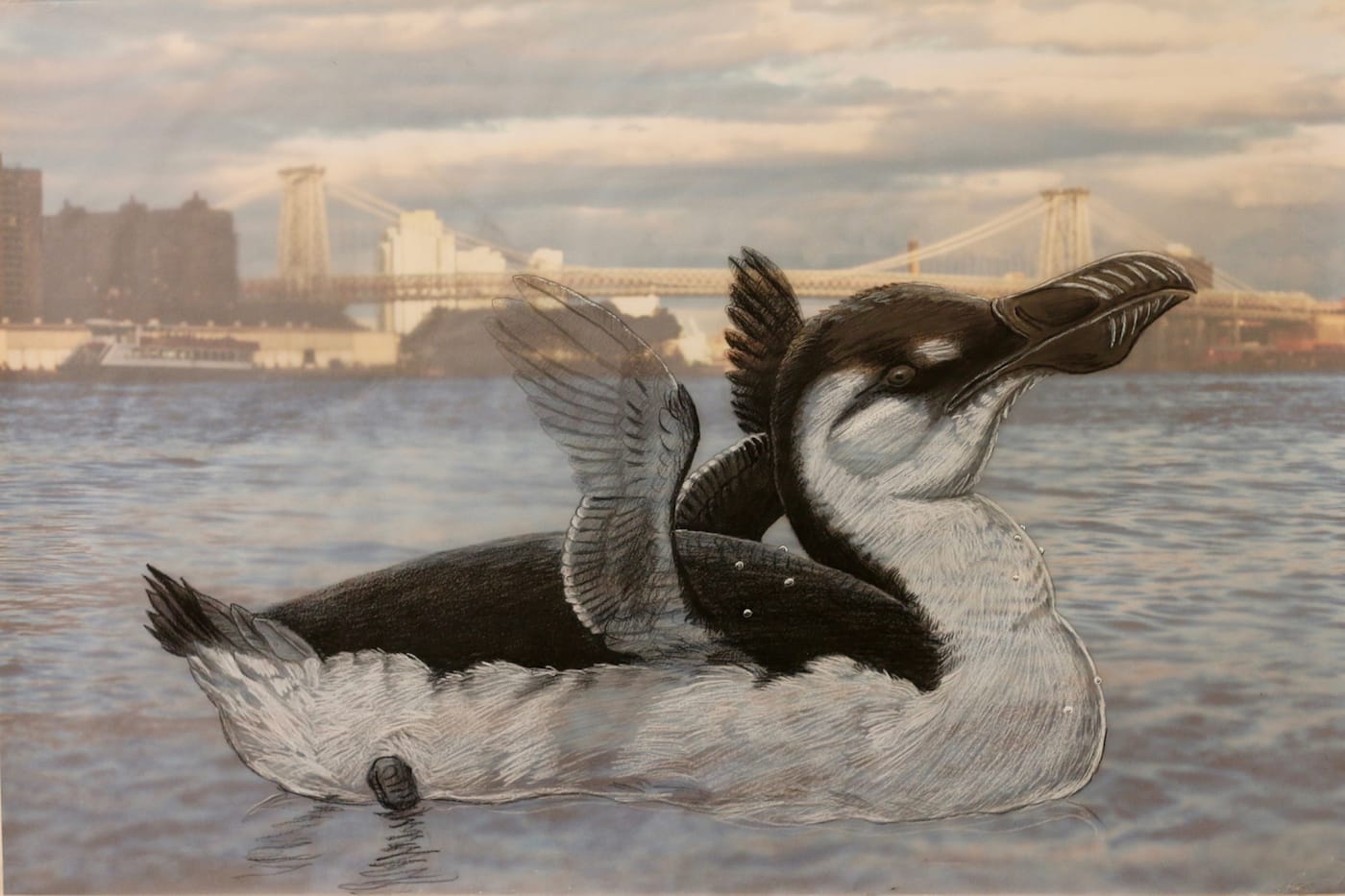 At Wave Hill in the Bronx, there are two exhibitions that consider the modern bird. Although not affiliated with the Year of the Bird, they’re lively portals into conservation, the biodiversity of New York City, and the artistic influence of birds. Avifauna: Birds + Habitat is a group exhibition in the Glyndor Gallery focuses on these ideas, and the smaller solo show Ecolegiac: Missing Birds of NYC in the Wave Hill House features Gabriel Willow’s drawings of extinct area birds overlaid on contemporary photographs. Labrador ducks, last seen in 1878, are returned to the East River, and Carolina parakeets, extinct in the wild since 1904, perch in the trees of Union Square.