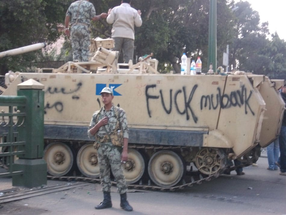 The tanks of the military are being used as billboards for graffiti. The clean, yellowish vehicles are now spotted with slogans cursing the current president, asking him to leave the Egyptian people alone, or asking for the support of the army.