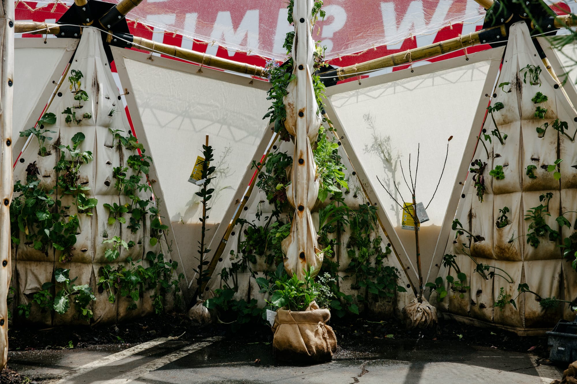 Along the walls of the dome-like structure, pockets teem with herbs, kale, and lettuce. Periodic mist keeps the plants moist, creating a vibrant, humid ecosystem in the middle of Downtown LA. Through an abolitionist framework focused on mutual aid, autonomy, and community care, the artists hope to build edible pods across neighborhoods in LA as a way to bring generative, healthy foods to places impacted by systemic racism.