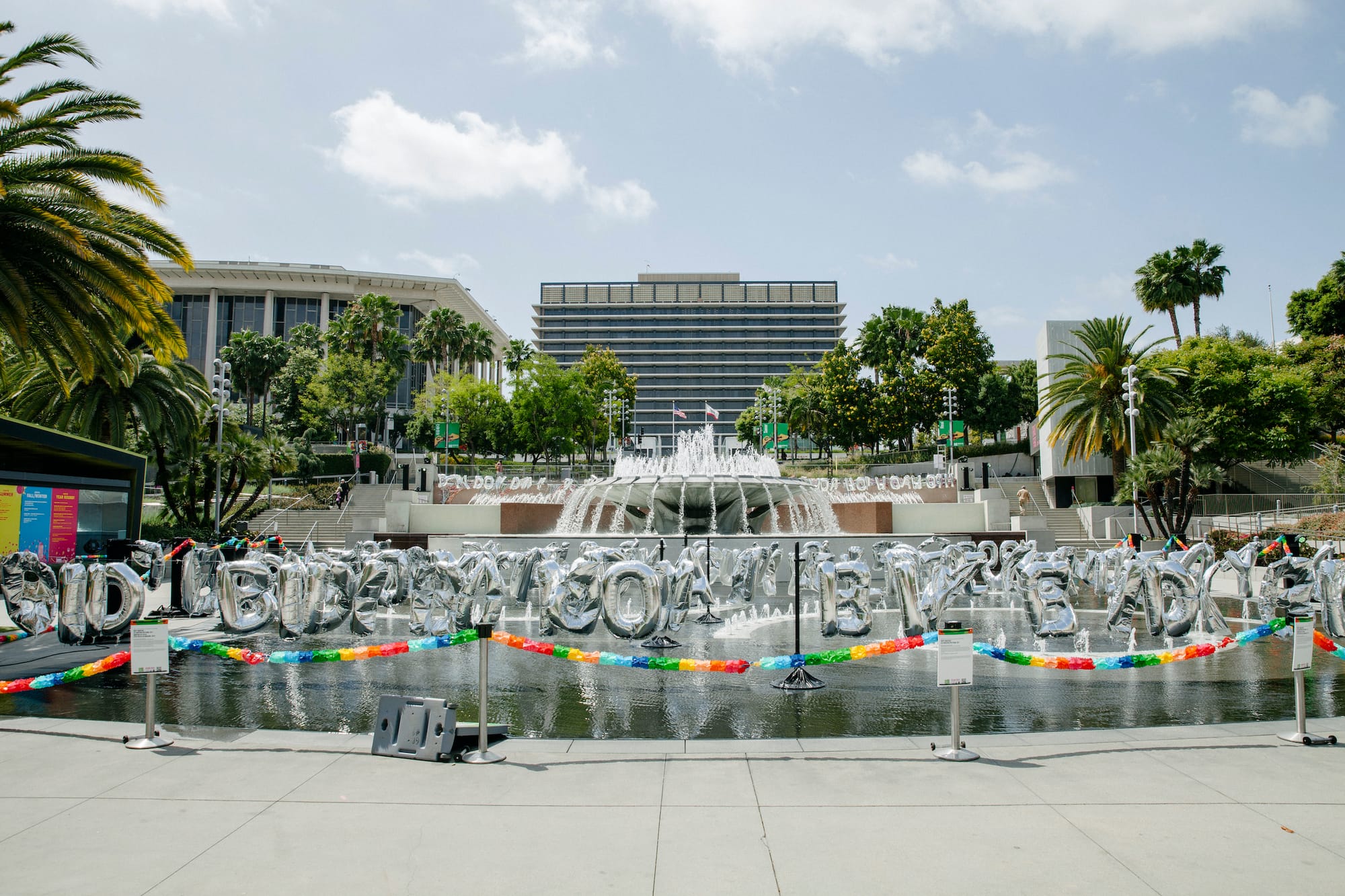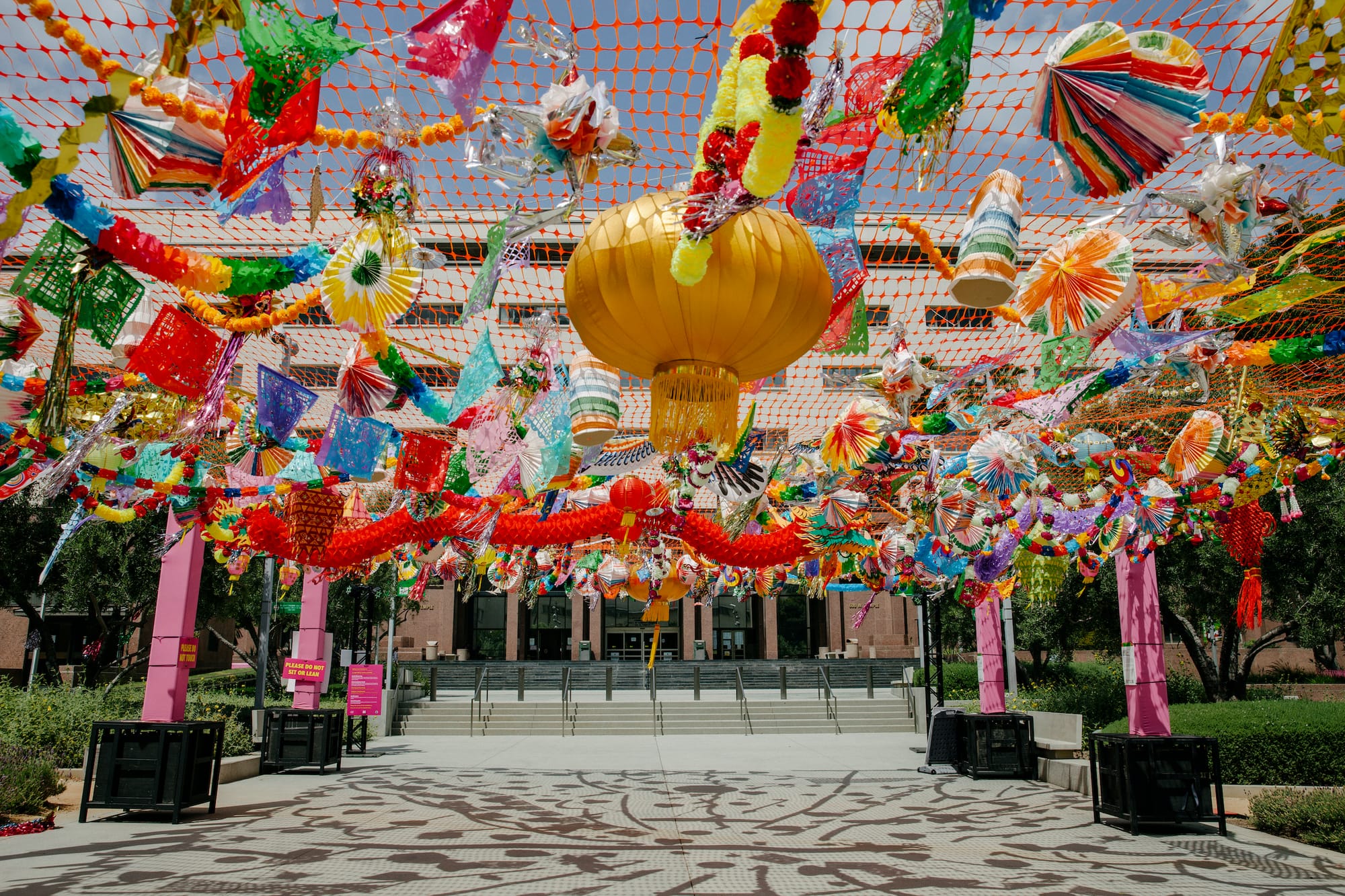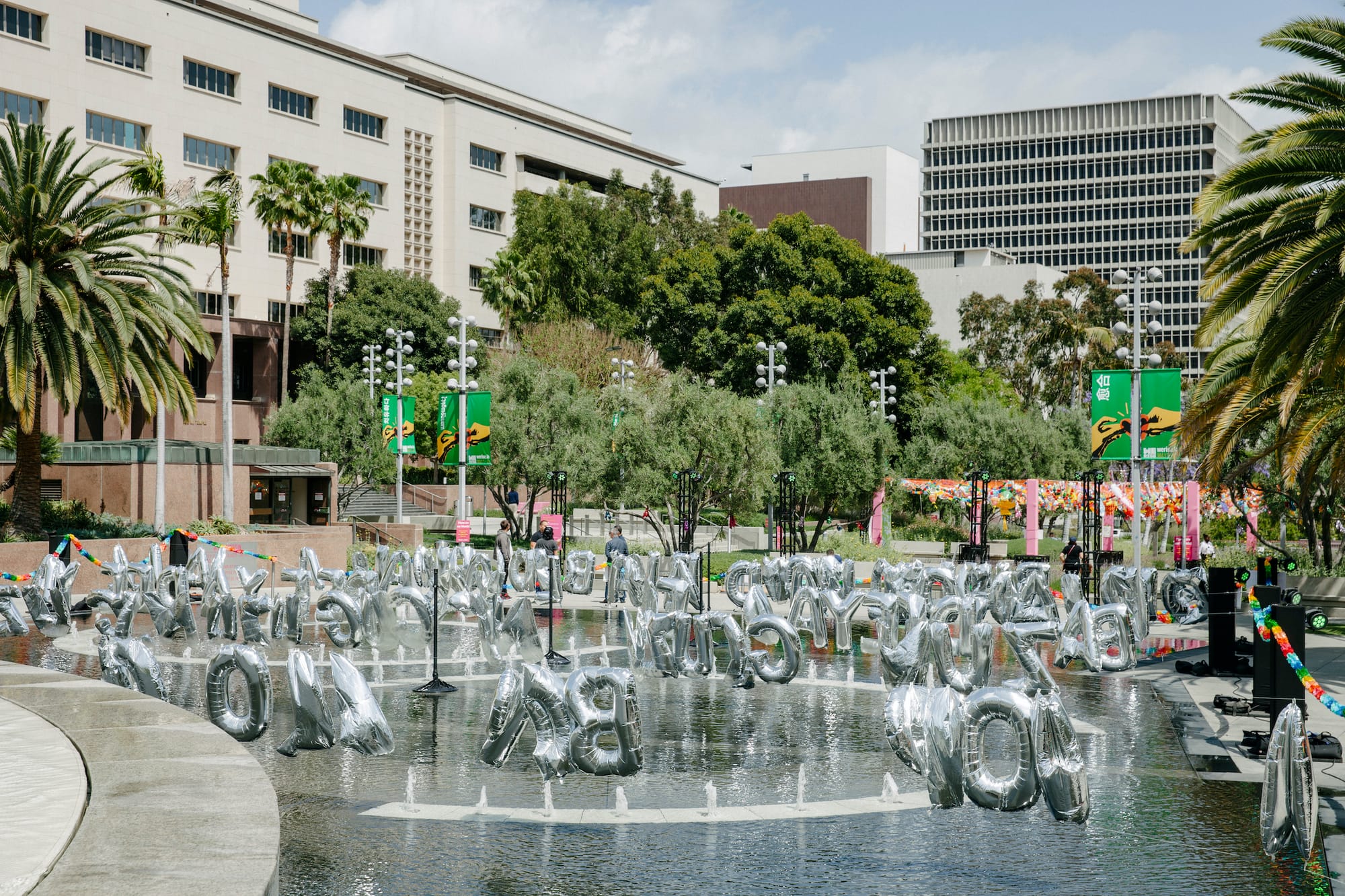 Up the street at Grand Park, Mexican artist Tanya Aguiñiga and dublab founder Mark “Frosty” McNeill designed an ode to all the missed and postponed festivities of this past year called “Celebration Spectrum,” featuring lively decorations and playlists from local artists. A colorful canopy of party materials sourced from the city’s various ethnic enclaves is the highlight. As songs play in the background, paper lanterns and dragons sway together with Día de Muertos papel picado and flower leis. Large metallic balloons spelling out celebratory song lyrics like “Bidi Bidi Bom Bom” float over the park’s fountain.