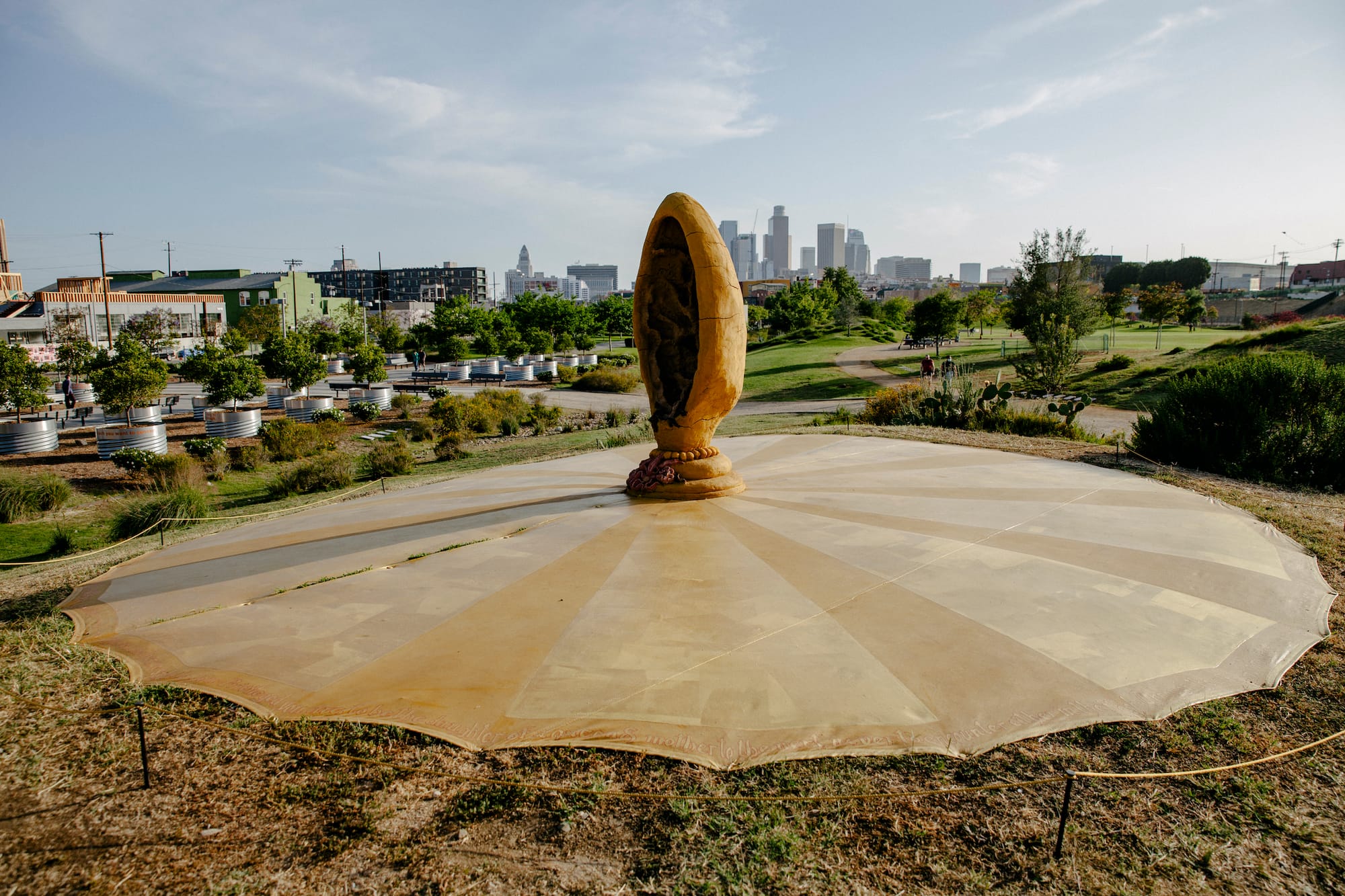 Healing from trauma and loss is a common thread through the Art Rise exhibits. At Los Angeles State Historic Park, artist veronique d’entremont built a sculpture inspired by bee hive caves in Griffith Park. A golden tapestry surrounding the sculpture describes the process of creating new bee colonies: When a new queen bee is born, the elder queen leaves to form a new hive elsewhere while her offspring rules the home she left behind. For the artist, this is an allegory for their mother’s suicide. The installation reframes a traumatic experience as one of regeneration.