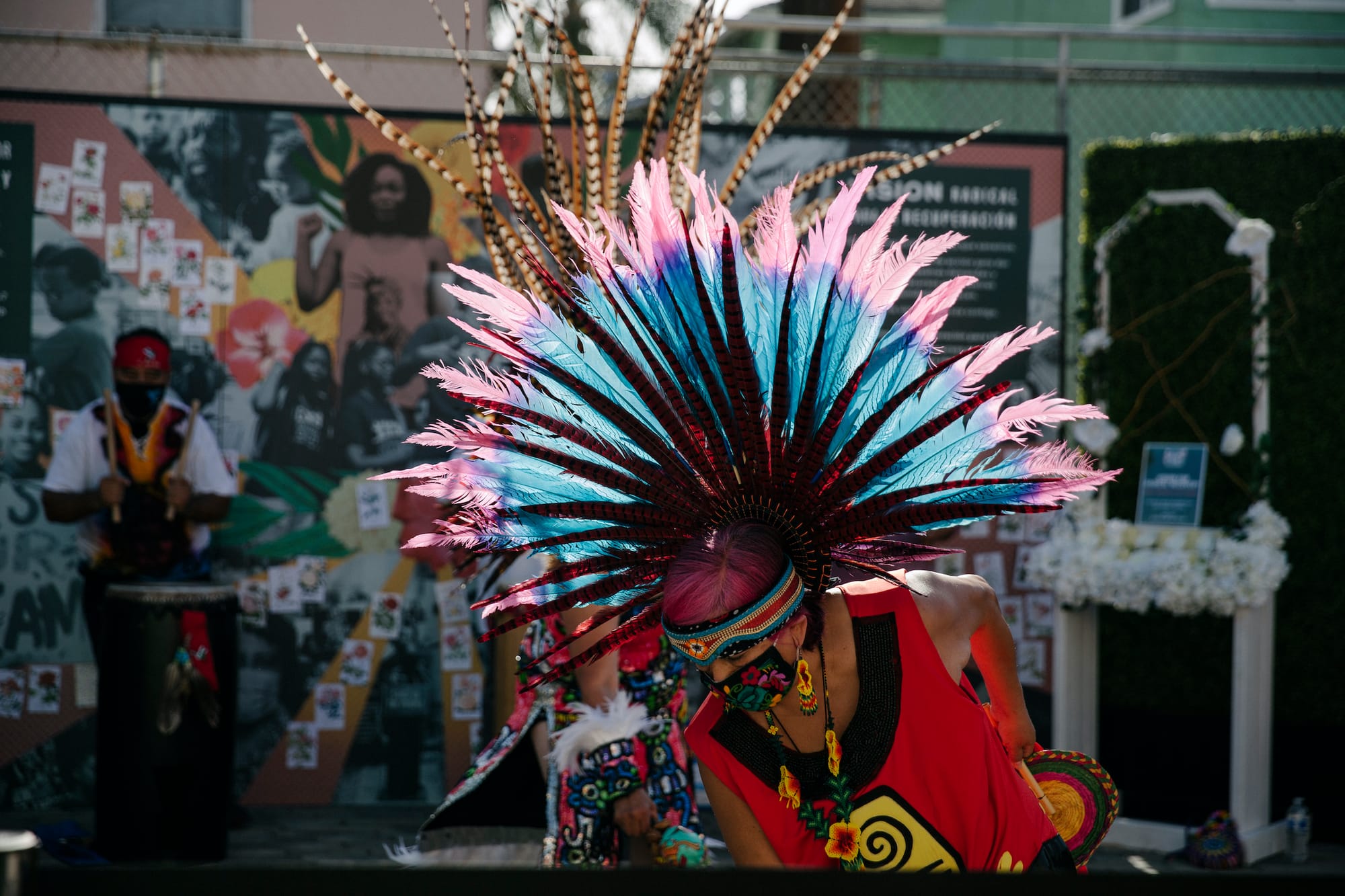 While some mourn the loss of a year spent inside and in isolation from community, others mourn the loss of loved ones. At Community Coalition’s South Central office, a community altar was created to honor familial ancestors and those gone due to COVID-19, systemic racism, and transphobia. Community members and local organizations placed portraits throughout an outdoor structure adorned with flowers and hanging wreaths. Last Saturday, Danzantes Aztecas blessed the altar with copal incense, drumming, and dancing.