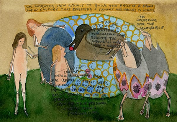 Wilson’s world is often inhabited by little girls who speak for the artist through speech bubbles. They roam around the picture plane and contemplate the world and people, including R. Buckminster Fuller, Paolo Solari and Murray Bookchin. There’s a romance to these images that is seductive and warm.
