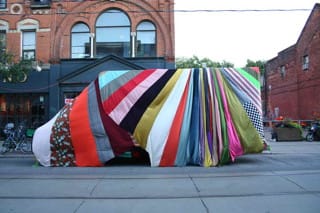 In celebration of Northside Art, and in conjunction with its current exhibition, Spectrum Vision, at Northside hub Reverse Space (meaning you can pick up festival maps and guides here), roving curatorial group Ad Projects is presenting a one-day, large-scale public art installation by artist Amanda Browder. Browder, who is featured in the exhibition indoors, will take to the street to install a 17-foot U-Haul truck draped in fabric donated by people from greater New York City and Toronto — an industrial eyesore transformed into a colorful street sculpture.