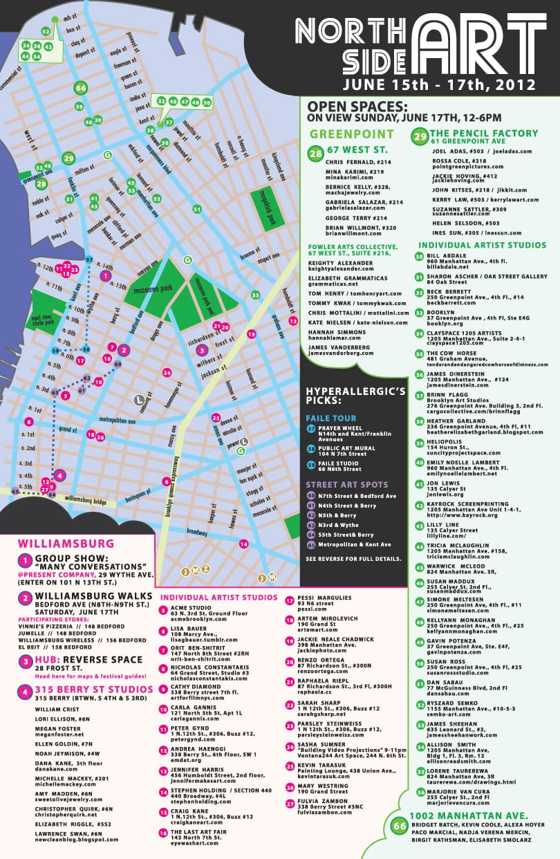 After having your fill of Manhattan last week, the doctor is shipping you back to Brooklyn, where Northside Art, formerly Northside Open Studios, formerly Greenpoint Open Studios, takes over for the weekend. Although it’s not as massive as its cousin Bushwick Open Studios, and still working to catch up with the Northside Festival’s highly promoted music side, Northside Art has grown over the years to become a strong Williamsburg and Greenpoint presence. And like any good open studios/festival smorgasbord event, it offers a chance to roam the streets, meet artists and see their work in progress, get friendly with your neighbors and maybe pick up some art along the way.