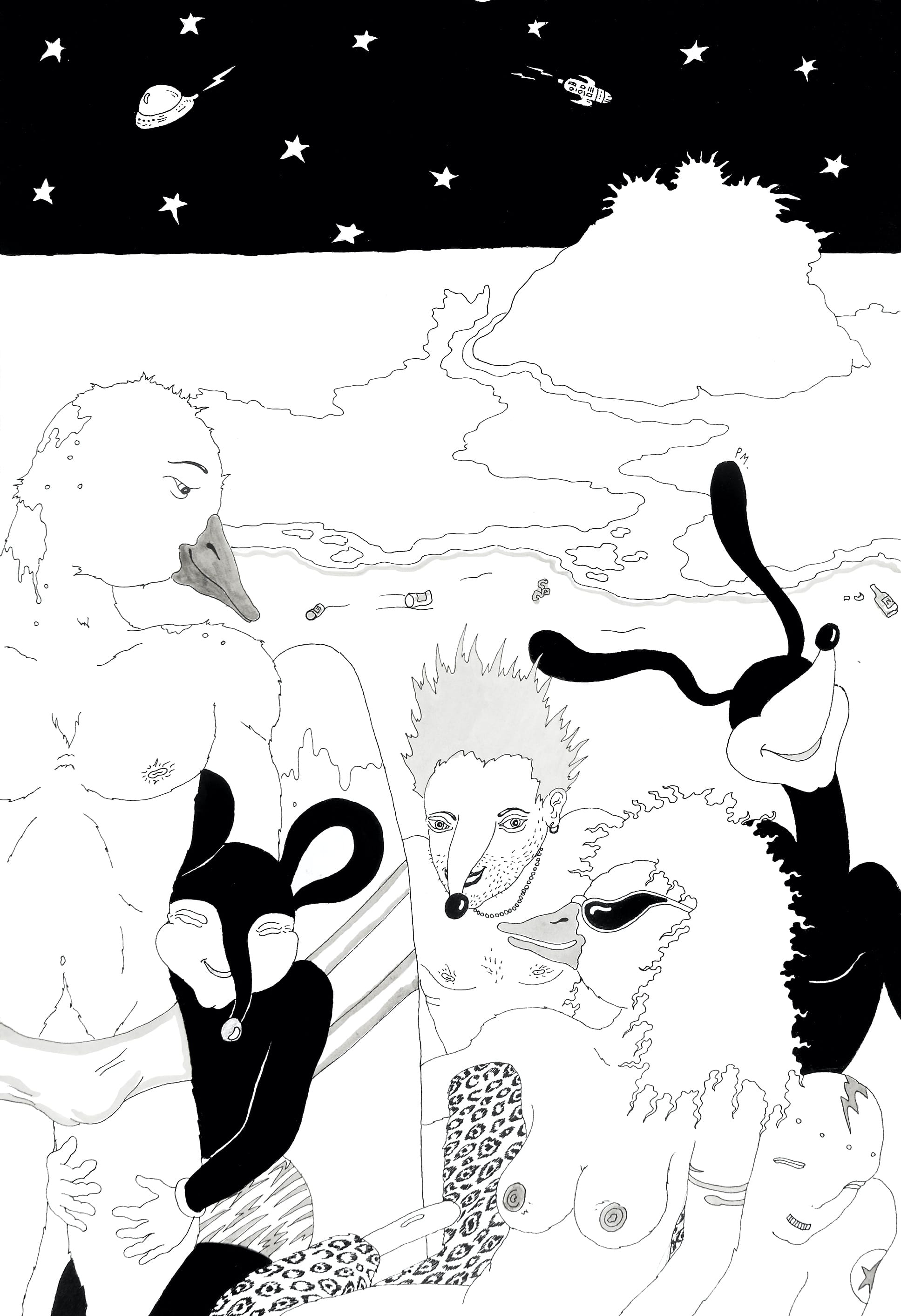 As dictatorial regimes raged in Argentina and Brazil in the early 1980s, Marcelo Pombo was drawing happily fornicating hybrid creatures with duck beaks and bulging boxer shorts. In 1983, the artist joined the Gay Action Group (GAG) in Buenos Aires, a group of dissident activists whose motto "Let's bring sex to the government and pleasure to power" also encapsulates Pombo's artistic practice. Inspired by the underground gay scene, incensed by the scourge of homophobia during the rise of the AIDS crisis and the persecution of queer individuals, he created a counter-narrative populated by outsider figures who shatter the status quo. Though perhaps less jarring to our contemporary eyes, these works are just as exquisite today. —VDL
