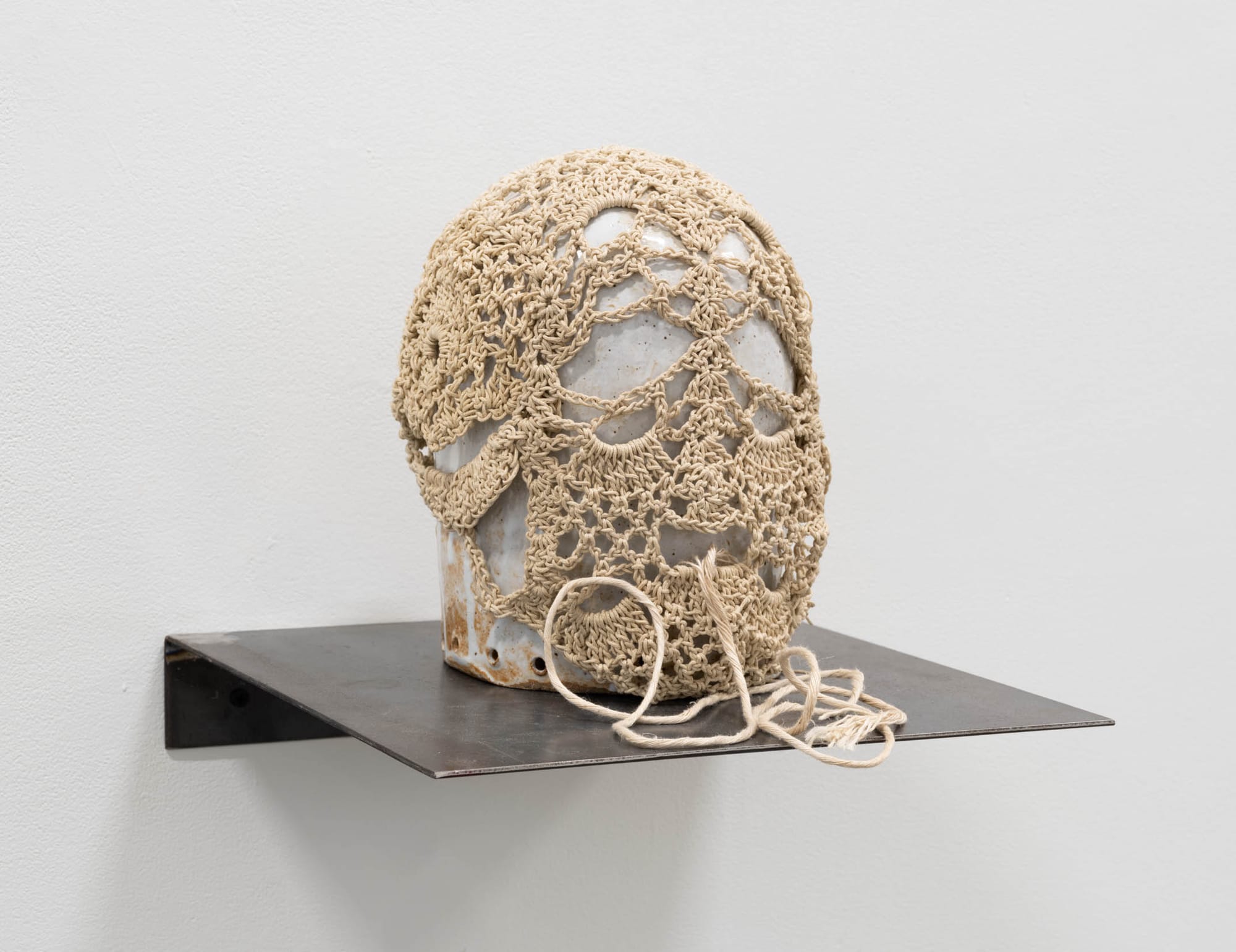 Mexican-American artist ektor garcía’s works of crocheted copper, leather, and other unusual materials join small found-object assemblages in this uncanny exhibition. “Cadenas perpetuas” (2023) — meaning “life sentences” in Spanish and translating literally to “perpetual chains” — is a sculpture of steel hooks and other metal pieces suspended from the ceiling. In a corner, “telaraña de cobre” (2020) — “copper spider web,” which is exactly what it sounds like — stretches over the gallery’s security camera. Is it a little unsettling that garcía’s linked-chain artworks, which seamlessly reference both handcraft traditions and mechanisms of oppression, are so aesthetically satisfying? Yes, and I think that’s the point. —VDL