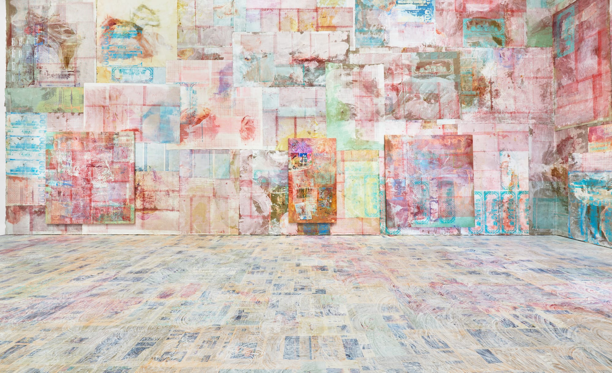 For her solo exhibition at Lehmann Maupin, Mandy Al-Sayegh convinced the gallery to accept an unconventional proposal: Throughout the run of the show, for a few hours on Thursdays, Fridays, and Saturdays, the space will be lent to dancers to hold rehearsals. In giant artworks papering the floors and walls, you’ll spot lines of delicate Arabic calligraphy, newsprint, counterfeit banknotes, silk-screened watermarks taken from El-Sayegh’s brother’s passport, and other seemingly disparate elements that coalesce to tell a story of what it means to belong. The show’s title and the artist’s choice to have dancers of all levels activate the space suggest a clever reshuffling of concepts of fame, recognition, and legacy. —VDL