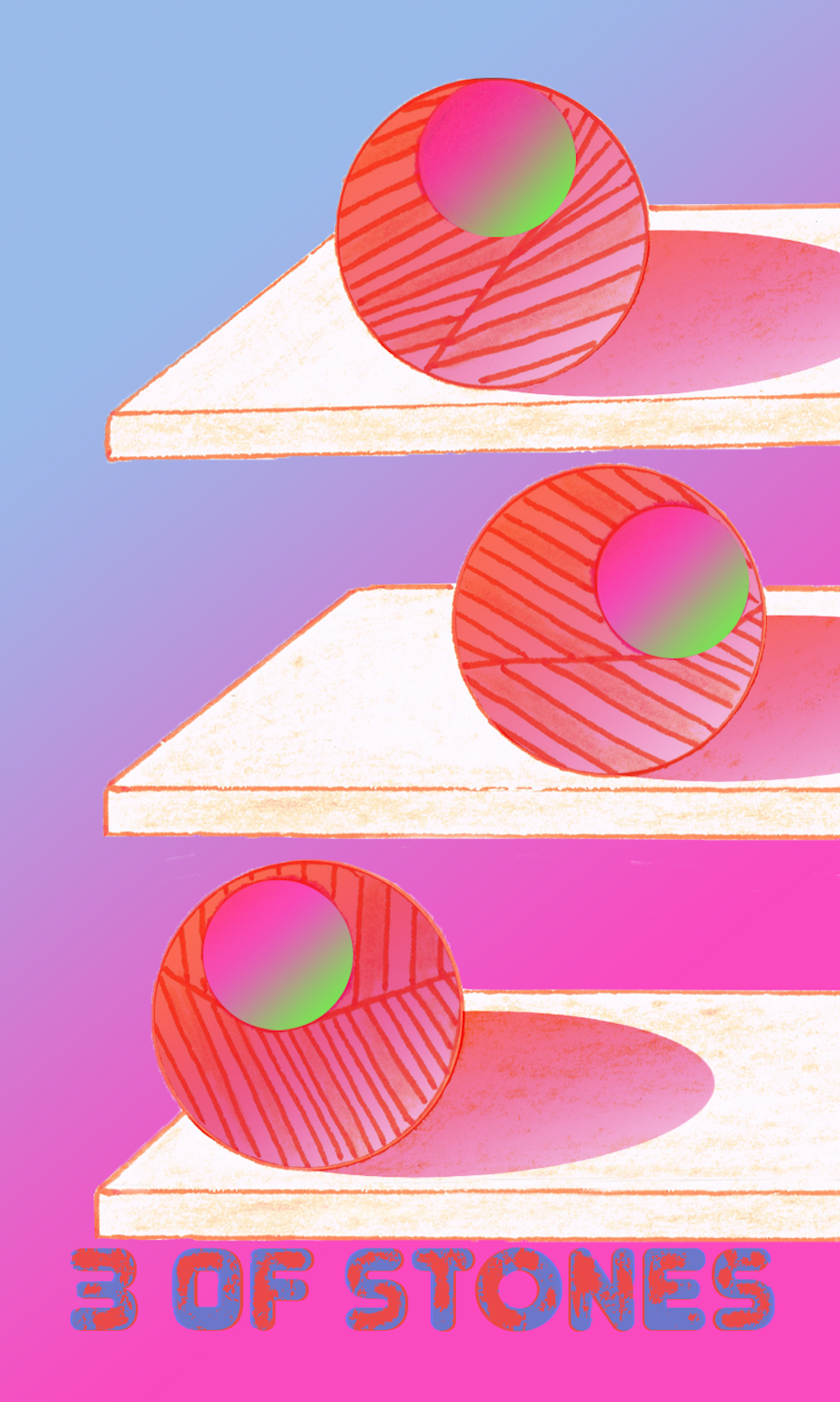 The Three of Stones is often the card of laying down foundations and making plans with others. In this rendering, each stone forms a layer in your practice, but they have yet to joined together. In this time of wintering, you’re invited to flow with the Air energies that move through your mind and start laying down your plan, or concepts of a plan, so to speak. That might look like making a project spreadsheet or gathering your collaborators for a meeting. Collect the stones and be ready to get to work.