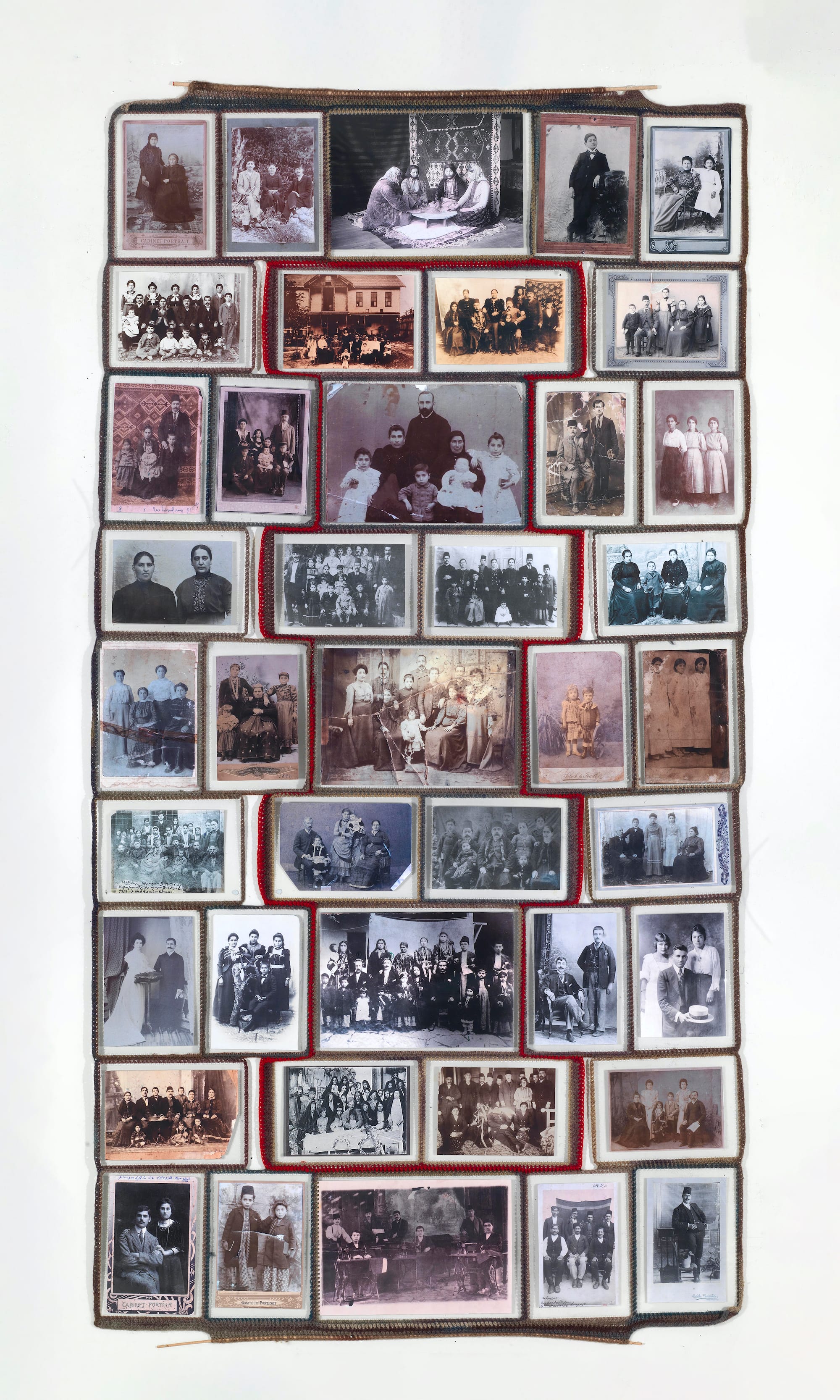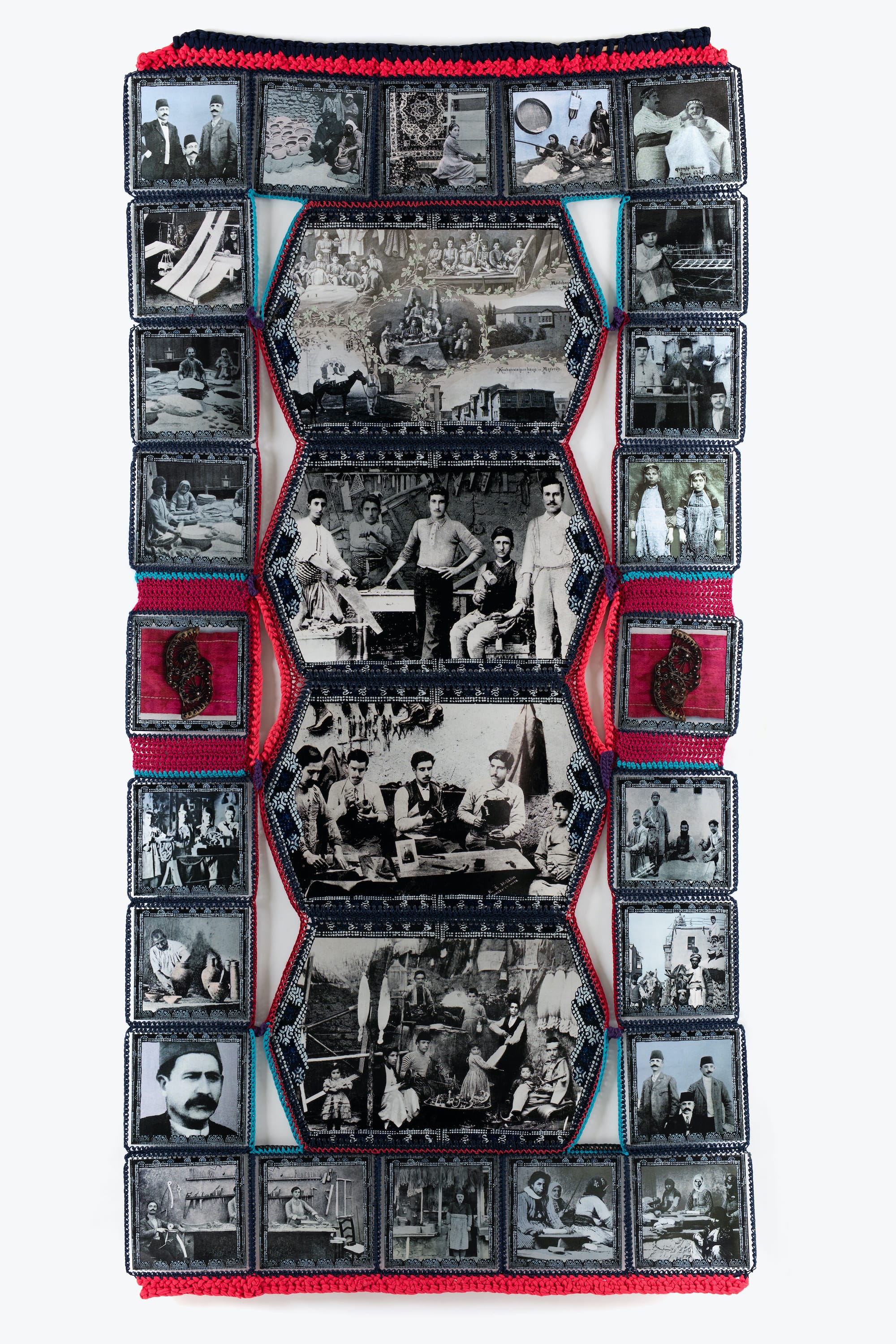 A good way to enter into Der-Meguerditchian’s work on memory, migration, and the Armenian past is by reading her monograph, Fruitful Threads, released in 2021. In the first section, titled “Quilts,” she weaves historical photographs and official documents into wall-sized quilts that illustrate the diversity of life for Ottoman Armenians. Photographs of women working in fields, children studying in schools, and men in workshops, as well as postcards of Armenian buildings, reveal glimpses of a once thriving and diverse community