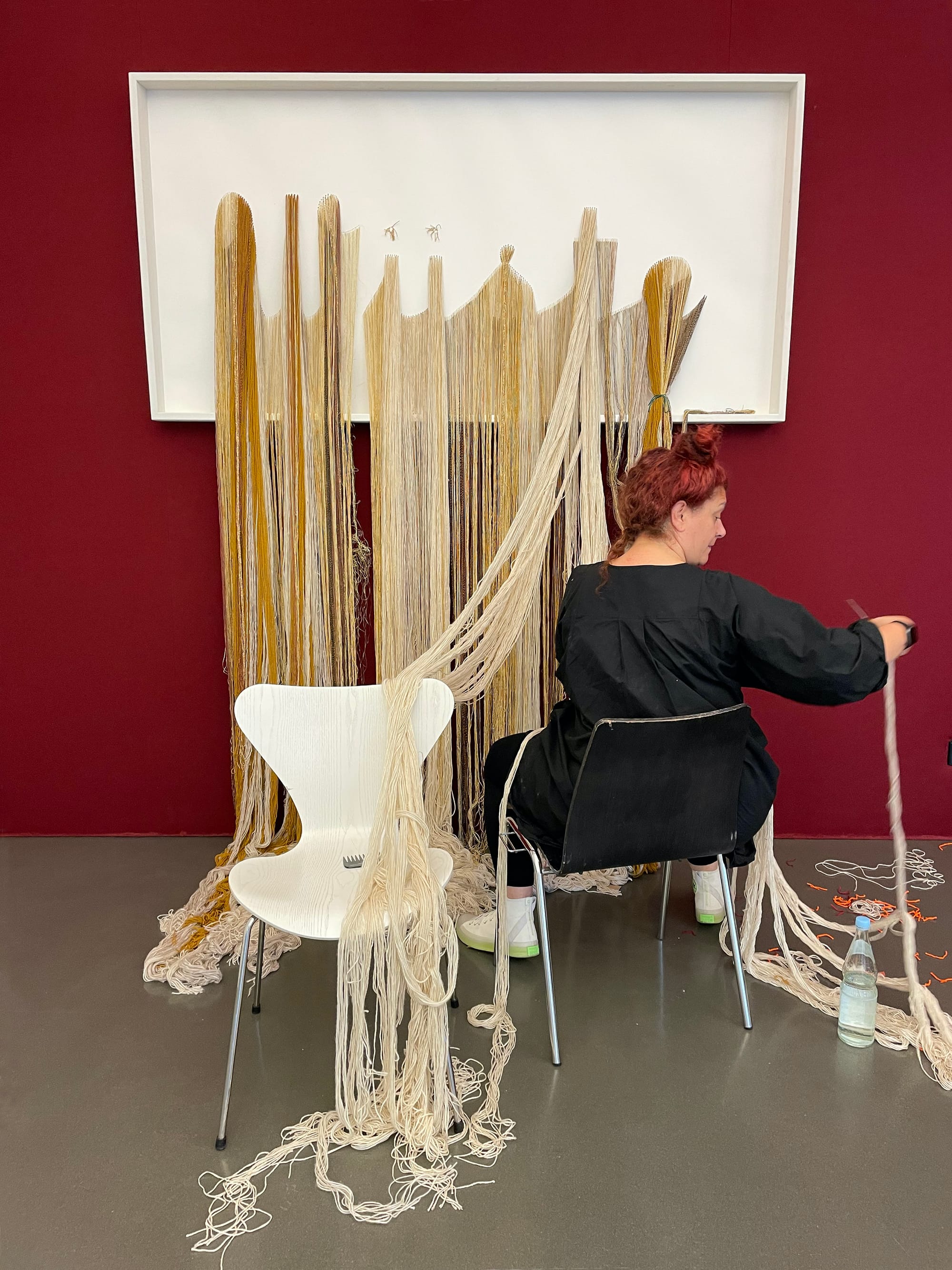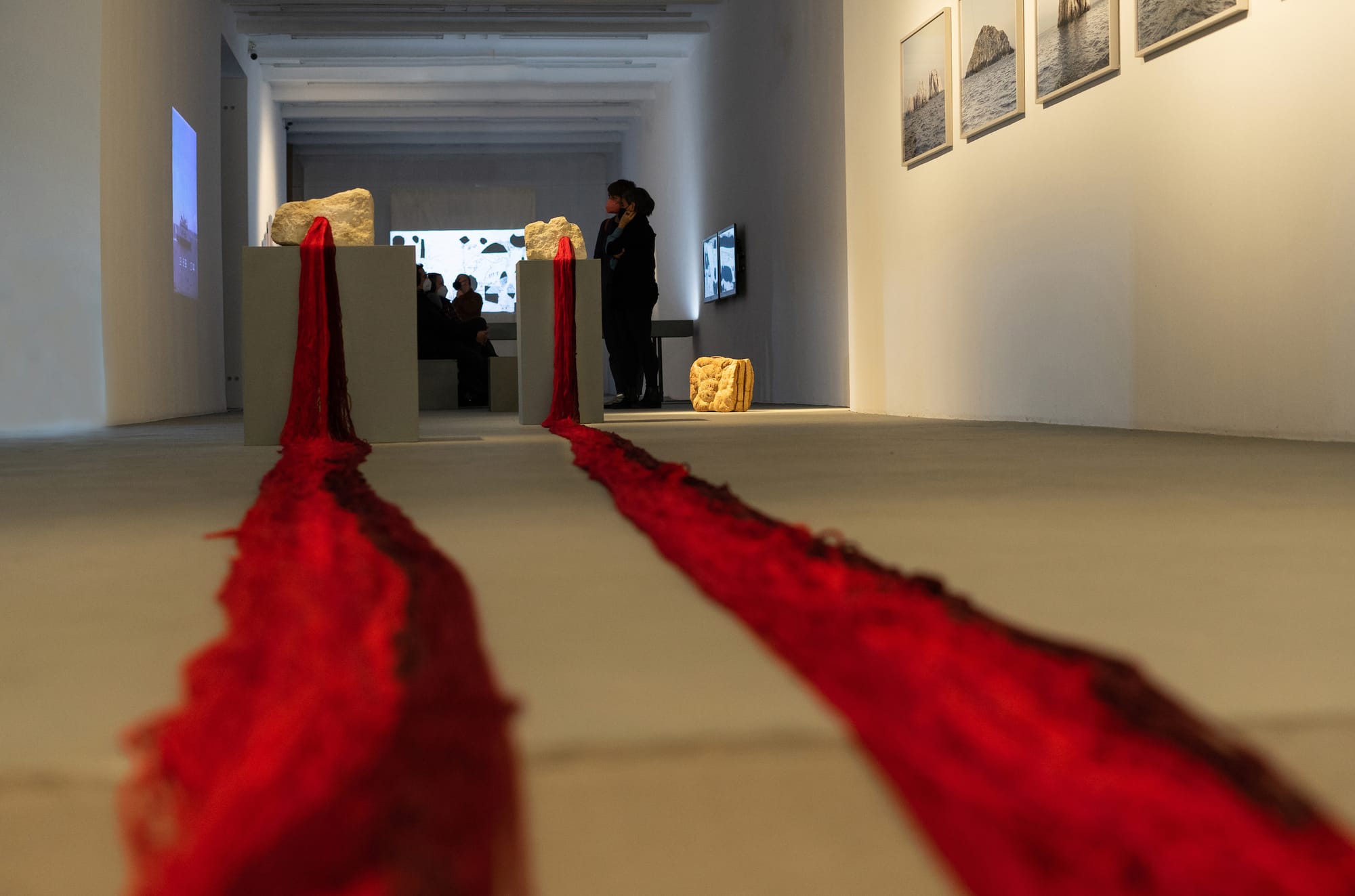 Earlier this year, she participated in an exhibition in her home city of Berlin, entitled Twister, which “explores both political whirlwinds and the absurdity of nationalistic claims to geography and nature.” To her, the tornado is “applied figuratively here to [represent the] recent upswing in nationalistic aggression and authoritarian tendencies on and beyond Europe’s eastern margins.” This has led to a new group of artists, including Turkish ones, making Berlin their home in exile. For her installation "Silence of Stones," “long strands of red wool emerging from rocks and spilling across the floor of the exhibition space recall the never-ending bloodshed resulting from conflicts based on ethnic and religious hostilities and the destruction of cultural heritage.”