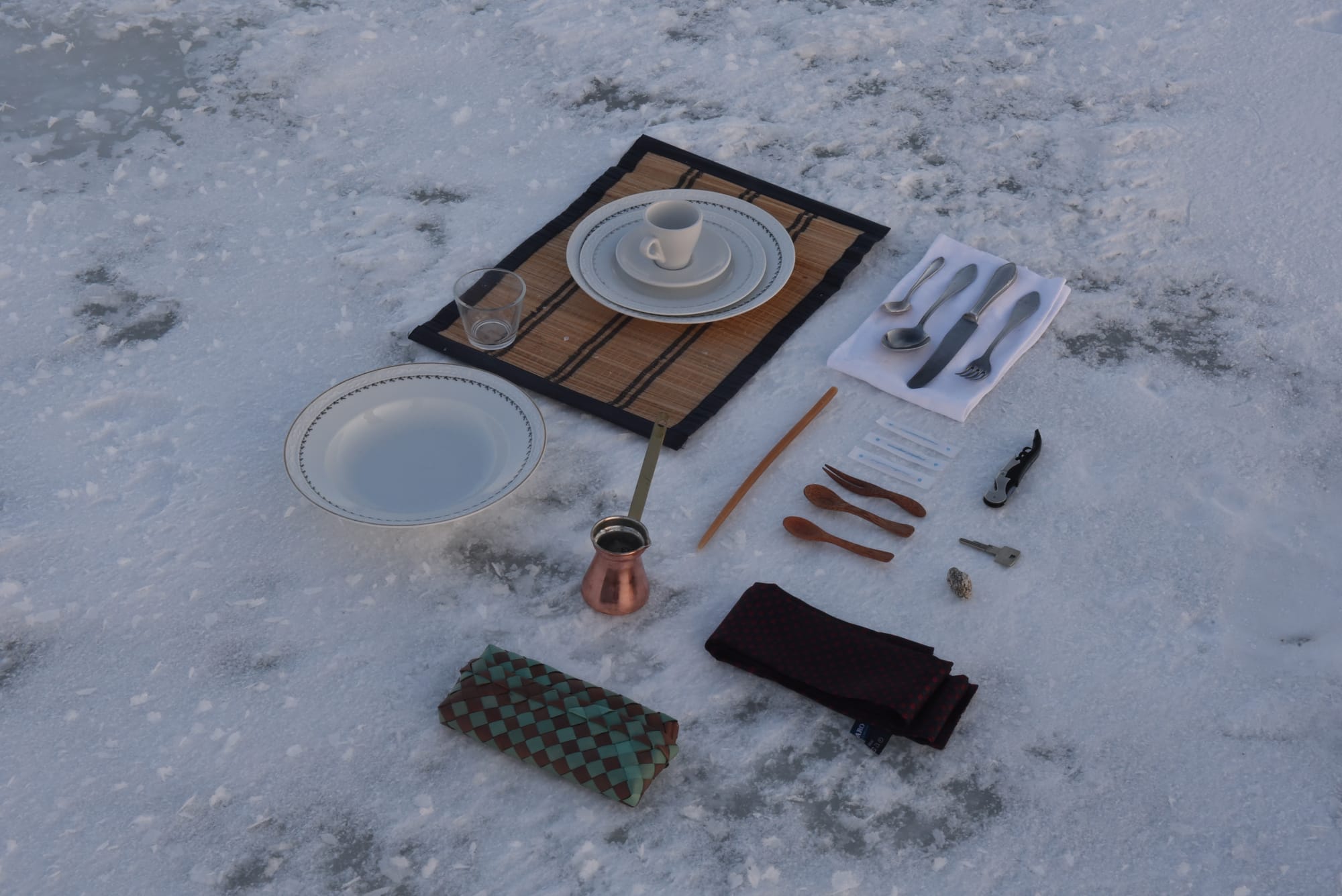 Olaf Nicolai, "Picknick, égoiste" (2020), dishes, flatware, basket, dimensions variable (photograph by Andreas Templin)