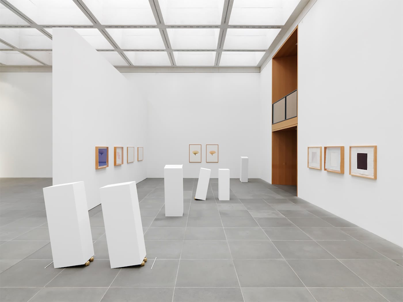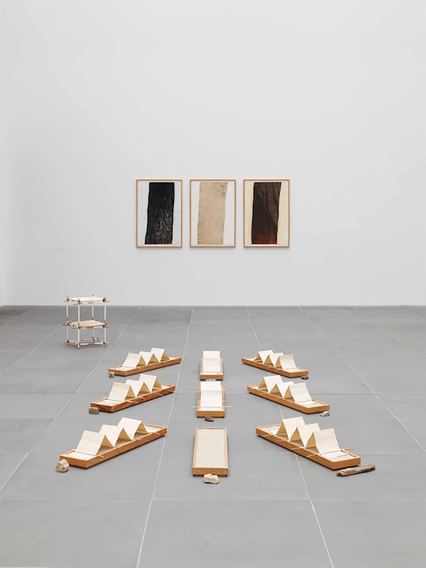 Friedlaender’s paper triptych “Homage to Nazim Hikmet” (1979), a central figure in modern Turkish literature, uses his metaphor of the tree to anthropomorphize both individuality and solidarity. This is juxtaposed with her installation “River/House/Book” (1981), composed from handmade paper, bamboo, cedar boxes, sand and river stones, which is another homage, this time to the dwellings of the Nagovisi people in Papua New Guinea, where she traveled in 1978 with her then husband, the anthropologist Jonathan Friedlaender. In her notebooks, Friedlaender writes about a trip to the Tongue of the Ocean, a deep oceanic trench in the Bahamas, and returning with a transformed perception of space, after which “I engaged in an effort to invent painting again, and made paintings that were not paintings. I made paintings depicting water, that is to say, depicting the spacelessness of space.”