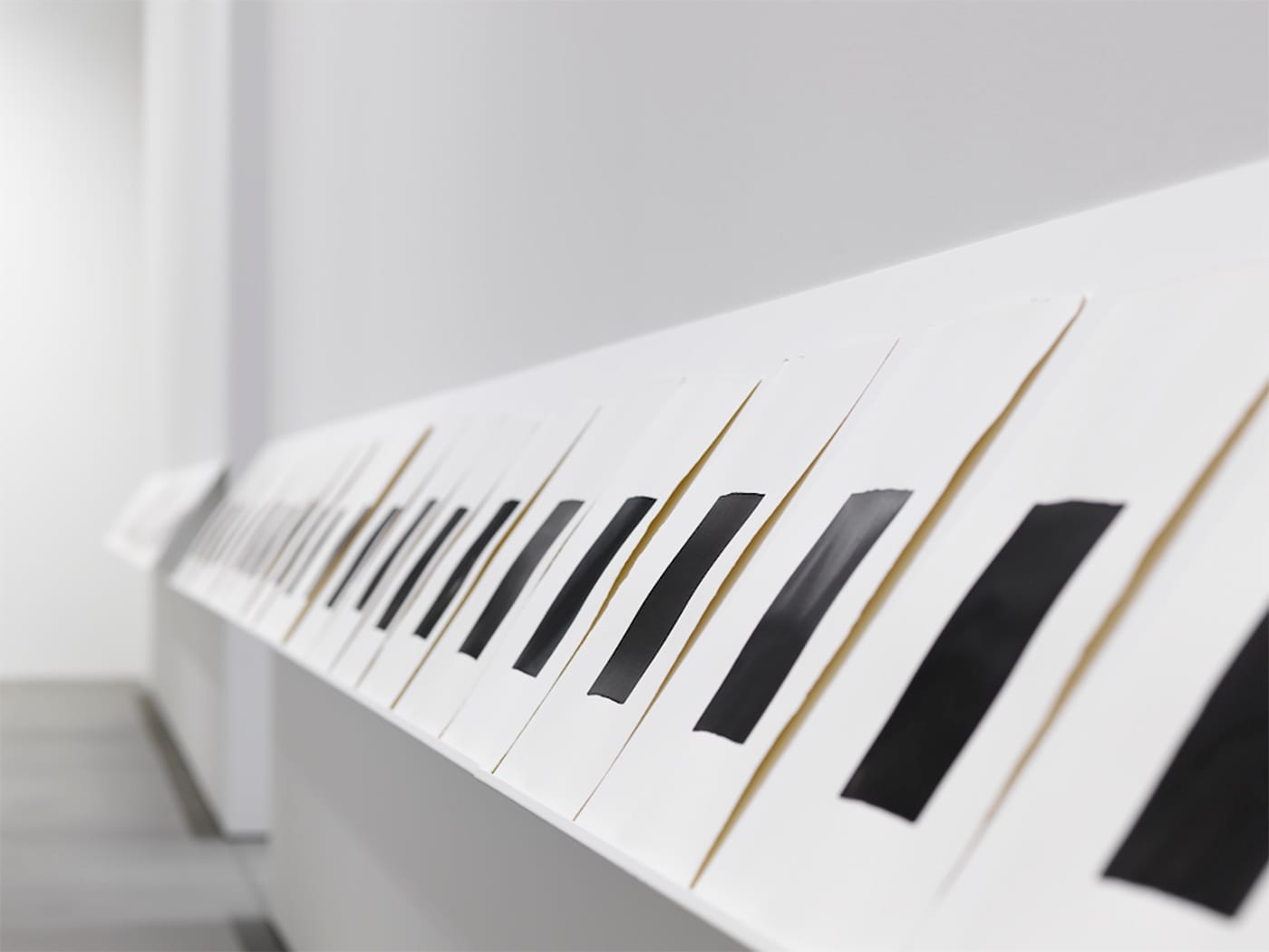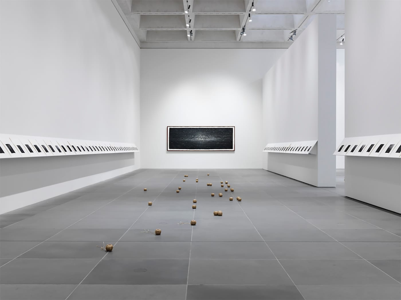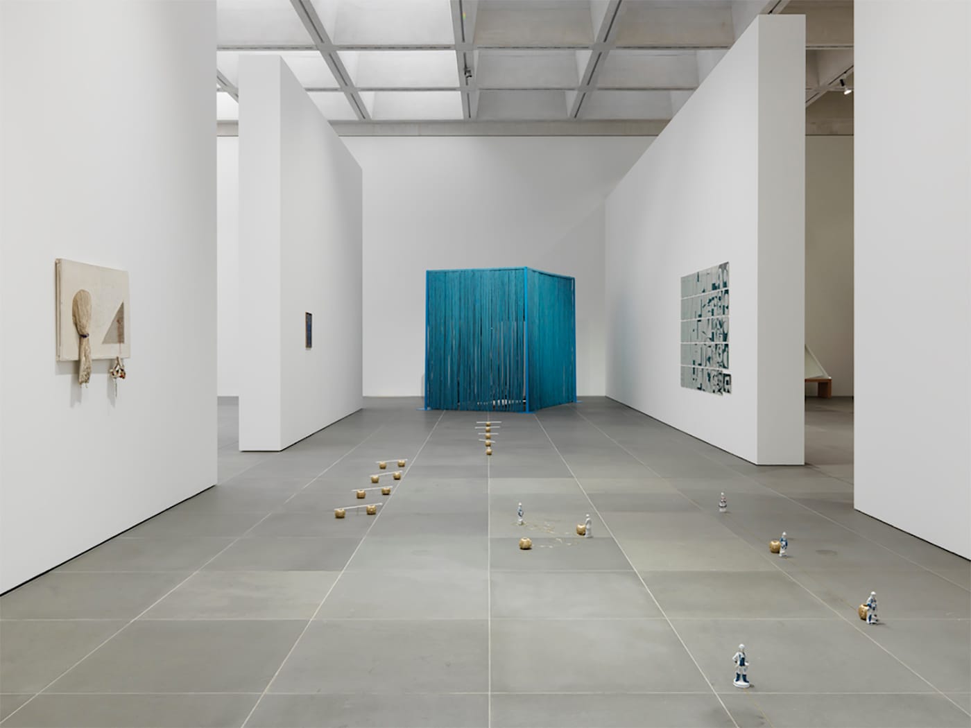 Onur on the other hand, presents a slightly modified version of her subtle but conceptually complex installation “Opus II – Fantasia” (2002). Originally created for the floor plan of Staatliche Kunsthalle Baden-Baden, this is one of her most iconic works from a later period in her career when her interest in the formal qualities of music led her to reproduce the concepts of variation, repetition and modulation, in site-specific, ephemeral installations. Knitting needles, tangles of golden chord, blue and white trinkets and plinths, allude to a kind of silent music sheet, the reading of which relies on an internal dynamic system that extends far beyond the formalism of sculpture. The installation spreads throughout the three exhibition rooms, glueing the exhibition together like a magnet inscribed with an indecipherable alphabet.