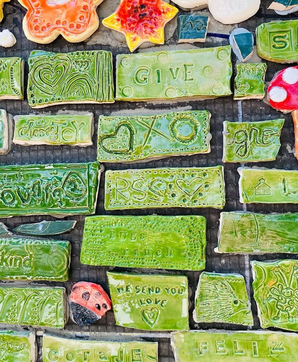 By August of that year, Montemayor had launched “Tacos and Tiles” at Uvalde’s St. Henry’s church, where she invited survivors and community members to make mosaic fragments in community art therapy sessions. Over the course of months, Montemayor fired thousands of clay tiles designed by students, teachers, and families in Uvalde in her kiln, an initiative she dubbed the Uvalde Love Project. Her back-and-forth commutes to Uvalde culminated in a mosaic mural installed in town in August 2023, the result of a year of community clinical art therapy facilitated by her and a team of therapists.