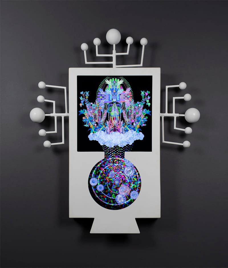 The upstairs exhibition, Saint Somebody, examines the notion and aesthetics of sainthood, pulling together work from the Thoma Foundation’s collections in Digital & Media Art, Contemporary Southwestern, and Art of the Spanish Americas. Artists include José Armijo, Dara Birnbaum, Desmond Paul Henry, Cauleen Smith, Anne Spalter, Bill Viola, Saya Woolfalk, and an unidentified artist from 18th-century Cuzco, Peru. The exhibition asserts that “the litany of saints is also a history of art,” and presents a timeline of works in response to that central theme as evidence.