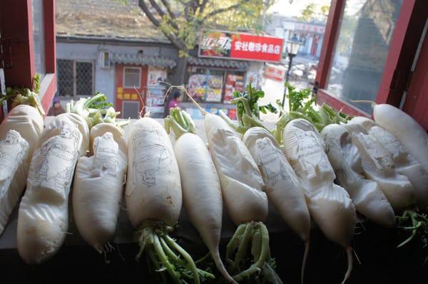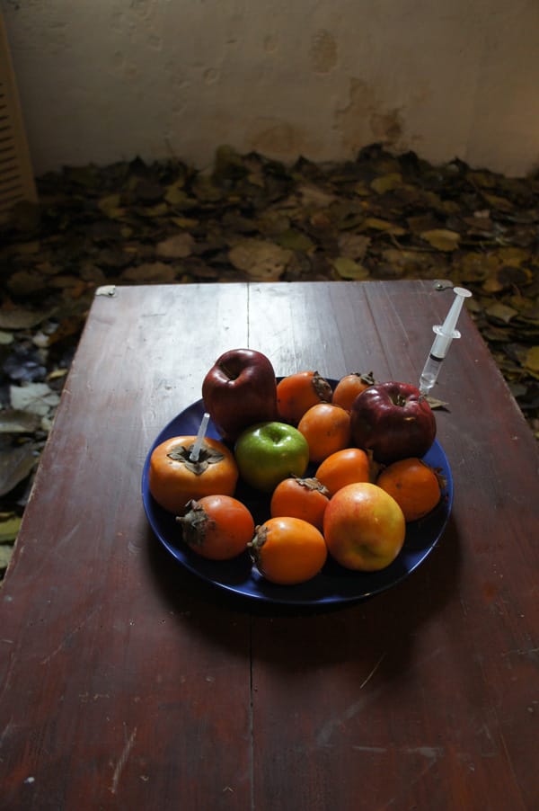 The six artists involved transformed one of the rooms into a crepuscular vision of art and life. There were Buddhist figures carved into big white radishes, a dragon made of cabbage and a still life with poisoned apples and persimmons.