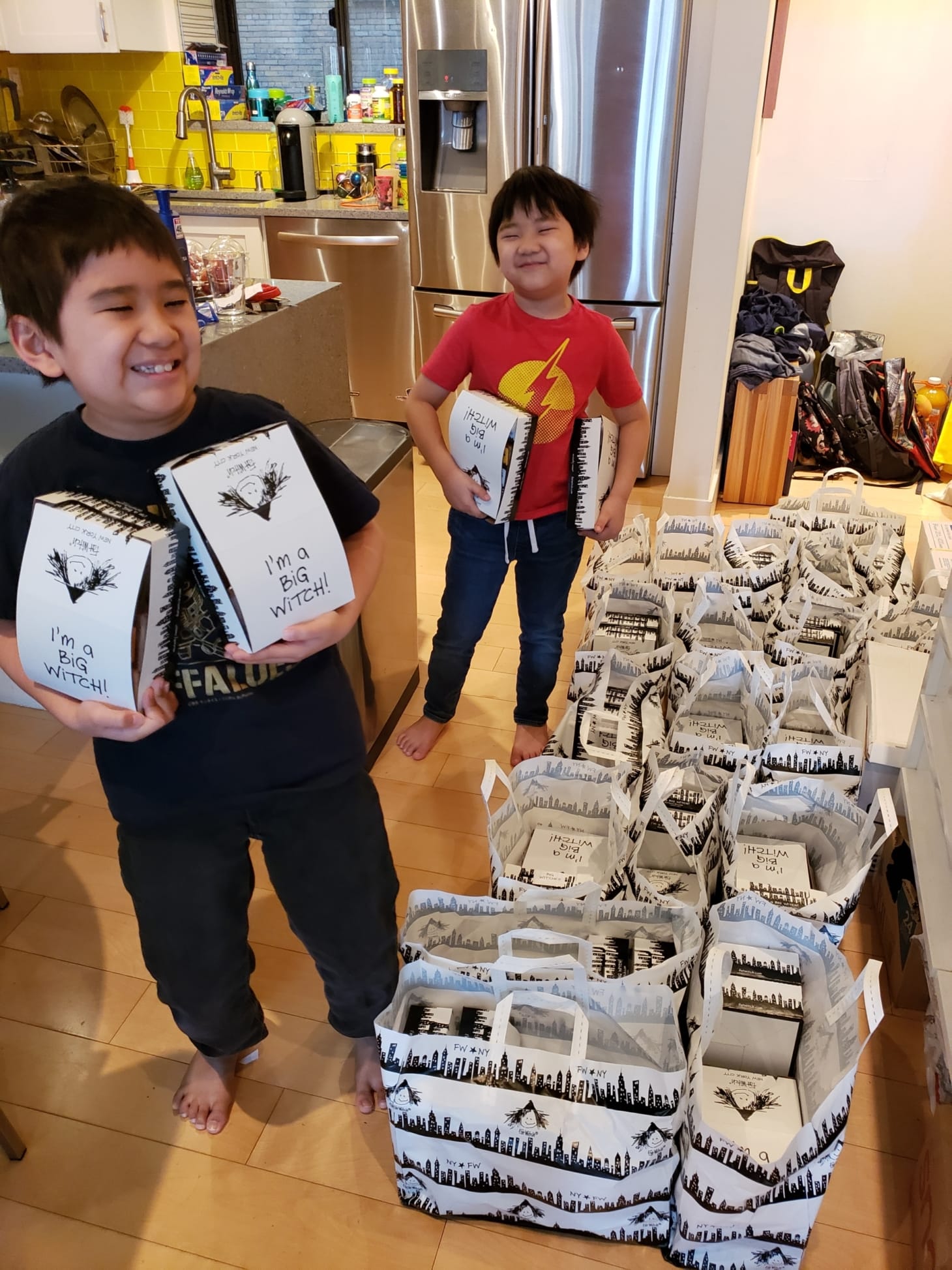 Joanne Kwong’s sons holding brownies from Fat Witch Bakery donated to healthcare workers as part of her Masks for Docs and Nurses Campaign (courtesy of MOCA OneWorld COVID-19 Collection)