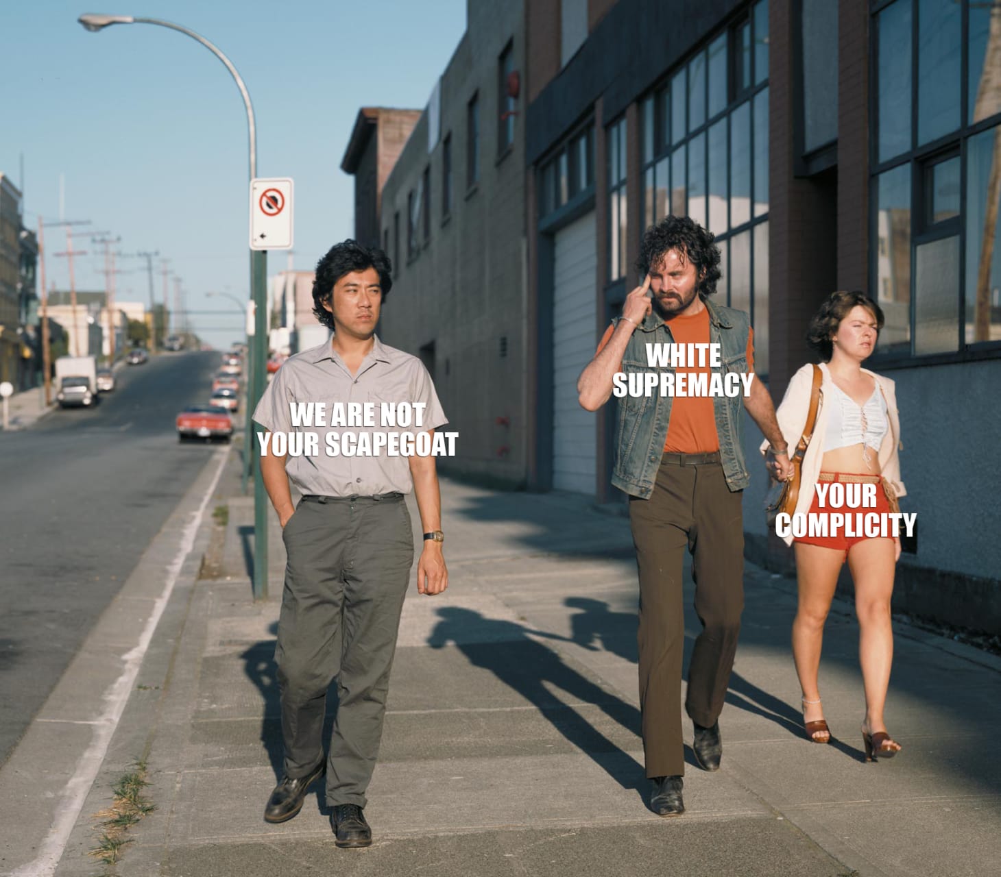 A meme created by SDA based on Jeff Wall’s 1982 staged photograph “Mimic,” depicting a white man slanting his eyes in a gesture of mockery toward an Asian passerby (courtesy StopDiscriminAsian)