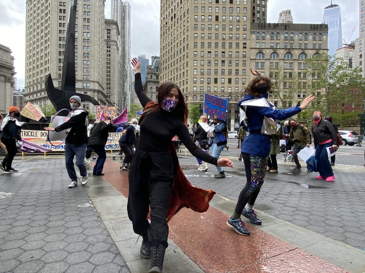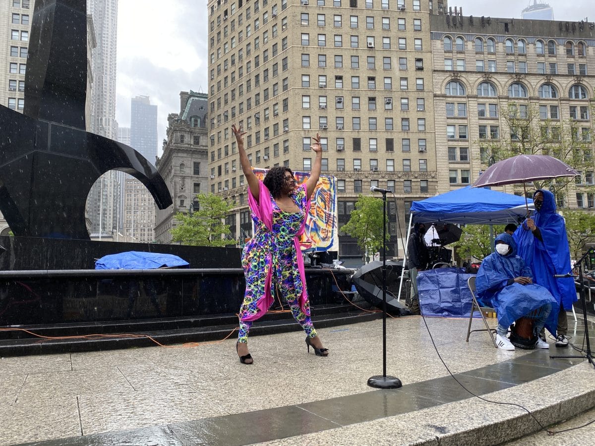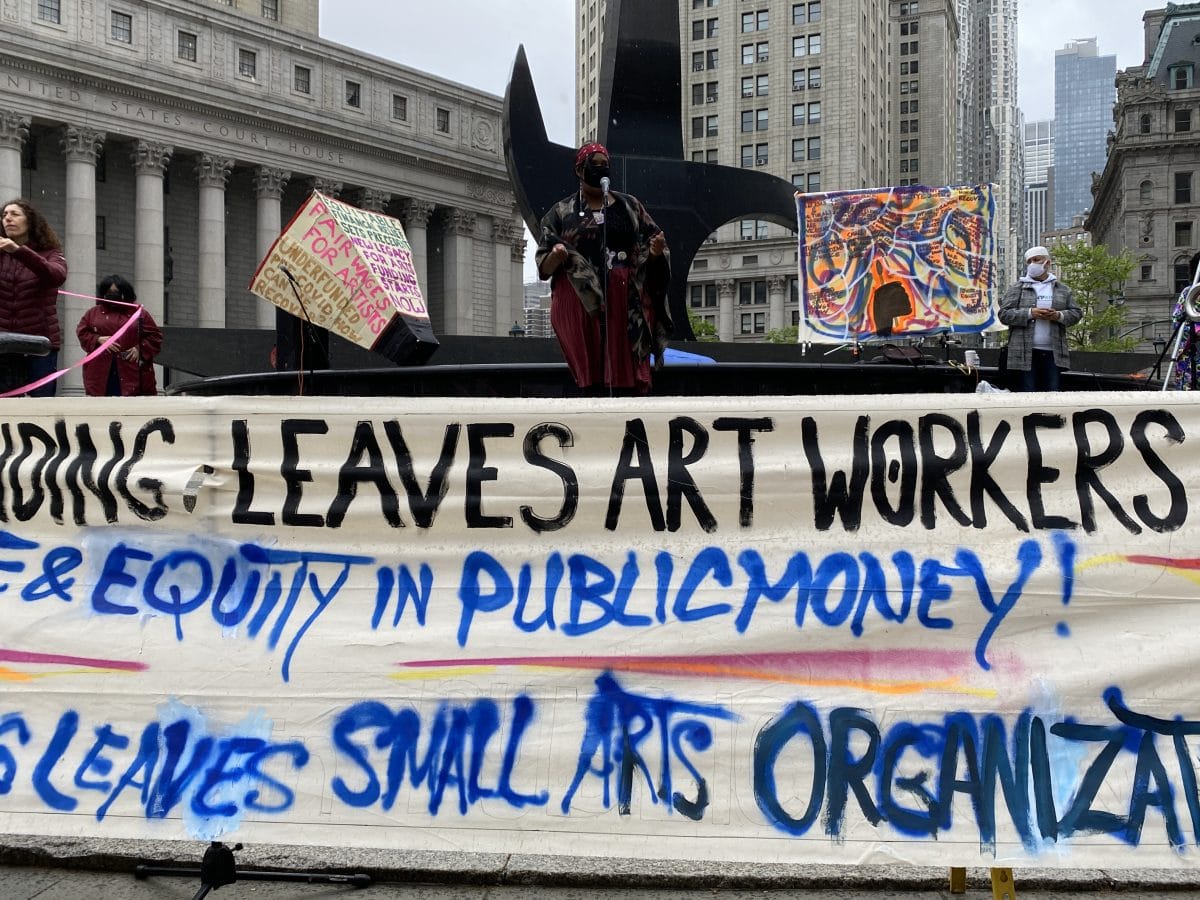 Despite rain and chilly weather on Saturday, May 8, a group of about 100 New York-based artists, performers, and art workers gathered at Foley Square in Lower Manhattan to demand immediate city relief for the arts and its workers.