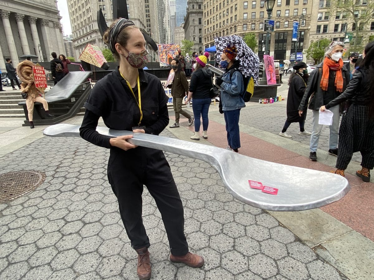 The protest was held two days after Mayor Bill de Blasio announced a $25 million artist relief program inspired by the New Deal’s Works Progress Administration (WPA). The program, City Artist Corps, is expected to pay more than 1,500 local artists to beautify and activate public spaces across NYC with murals, public artworks, performances, and pop-up shows.