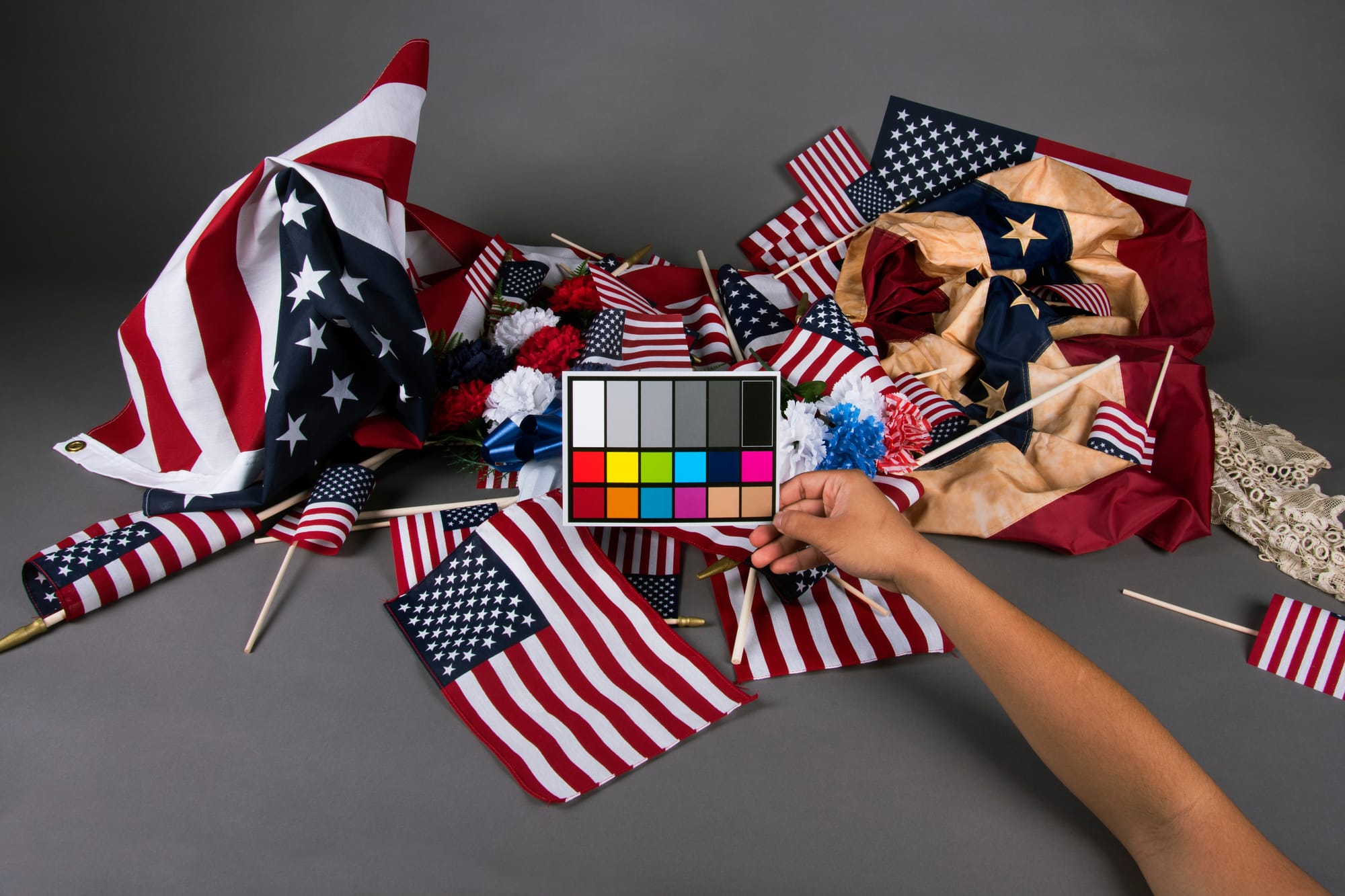 Art+Action featured artist Stephanie Syjuco’s “Color Checker (Pileup) 2” (2019).
