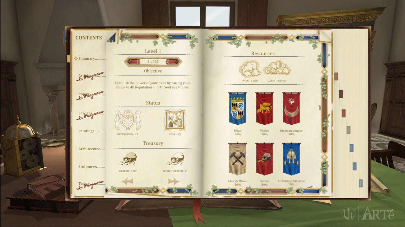 It took a couple of tries for me to make it through the first level. If my “Soul Meter,” represented as a painting on my digital desk, dropped to zero, I would be excommunicated. Likewise, if my “Reputation Meter,” visualized as a Medici crest, evaporated, I would be exiled. Nevertheless, I enjoyed the experience, even if I’ve failed to return from my Level 2 wrongful exile — thanks to the political meddling of the Albizzi family.