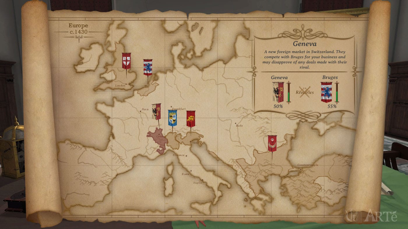 The setting of ARTé: Mecenas never changes; you’re always facing a desk (although it’s in drabber surroundings during exile, missing the bright Florentine view). The mechanics are fairly simple, with three “messages” arriving in turns, each presenting new choices, and a map and market, accessed by clicking on some scales, to buy and sell your wares. Almost every round involves a decision relating to the iconic art of the Italian Renaissance, demonstrating how patronage enabled the careers of creators, whether the sometimes controversial Donatello or the devout Fra Angelico, and was entwined with the influence of the Catholic Church in the 15th and 16th centuries. If you avoid morally questionable moneymaking like usury — or loaning money that enriches your own holdings — the Archbishop may place thousands of florins in his secret account. If Florence starts to hear rumors of your immoral actions, or move to not expand your bank to Geneva or Flanders, your reputation may be irreparably wrecked and your trade networks broken.