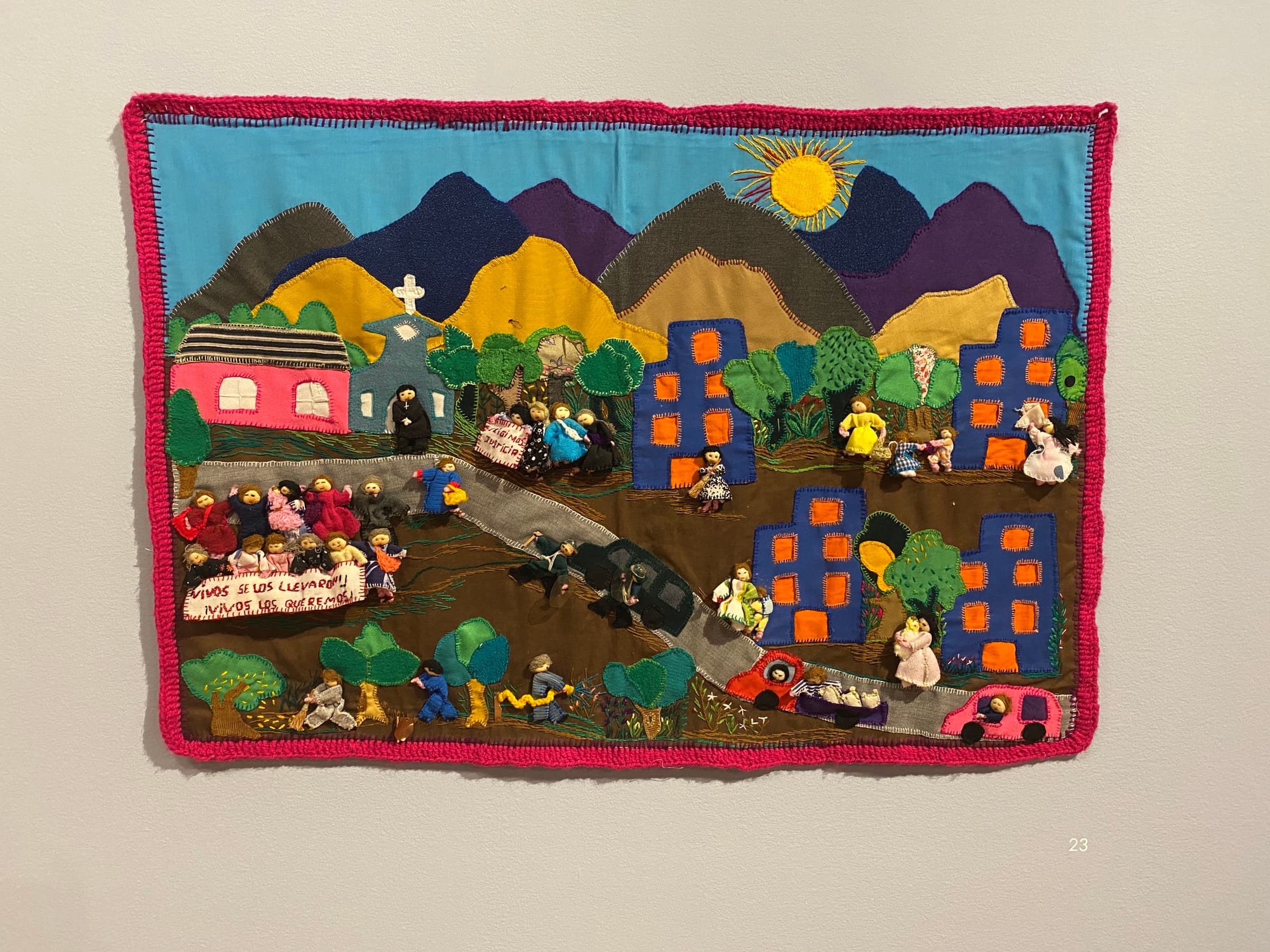 The women left behind — many of them mothers of those murdered — came together to demand justice through both protest and art-making. Chilean author Marjorie Augosín maintains that these women often found and recognized each other while searching for their loved ones in hospitals and morgues. Common Thread (2019), a documentary by Anthony Rauld featured in Arte, Mujer y Memoria, informs viewers that on the second day of the new military takeover, women started organizing movements to resist. One of those movements was the establishment of arpillera workshops. The arpilleras narrated the course of Pinochet’s brutal dictatorship through bold colors, broad stitching, and striking imagery, often incorporating fabrics from their disappeared children’s clothes.