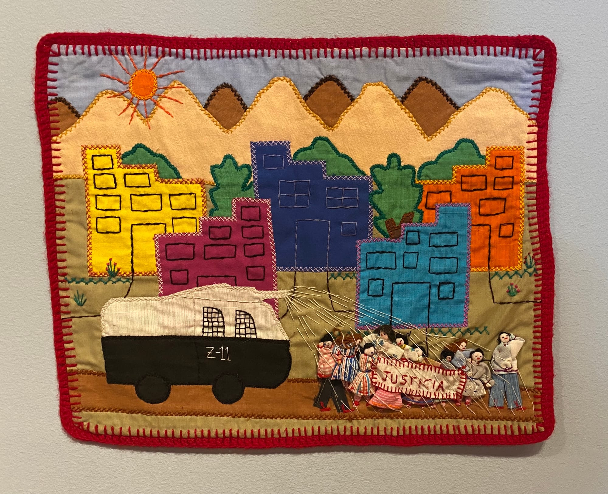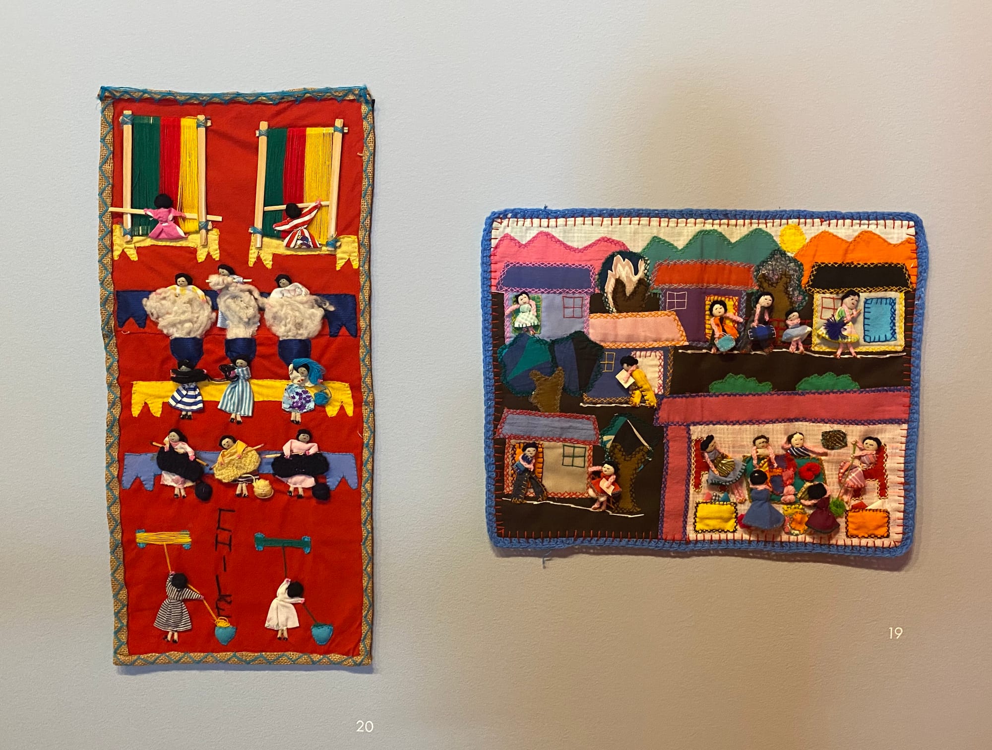 The development of this exhibition was in and of itself an act of female solidarity. The arpilleristas’ movement crossed continents when MEMCH-LA (Movement for the Emancipation of the Chilean Woman-Los Angeles) — an organization of female exiles that aims to amplify the voices of Chilean women — began to gather the artworks. Its mother organization, MEMCH, is the oldest women’s group in Chile. By collecting, displaying, and distributing arpilleras, MEMCH-LA has shed light on a cause invalidated by the Chilean government and rendered invisible in the United States. The arpilleras became a means of disseminating information about and supporting the arpilleristas’ resistance to dictatorship, strengthening the enduring bond between Chilean women activists and their diasporic counterparts. In addition to lending the works in Arte, Mujer y Memoria, in 2018 MEMCH-LA donated 49 arpilleras to the Museum of Memory and Human Rights in Santiago, Chile, returning this history to its national context.