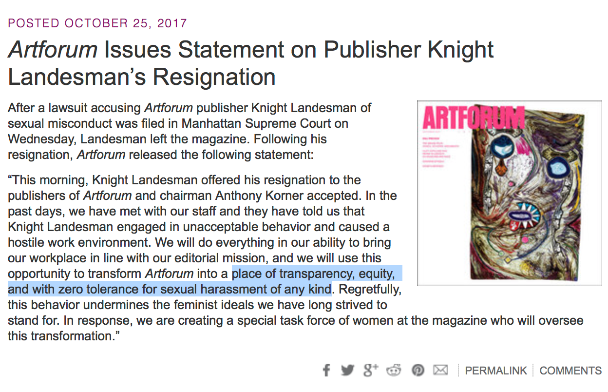 A few months after news broke about sexual harassment allegations against Knight Landesman at Artforum, some want to sweep the realities of the issue under the rug.