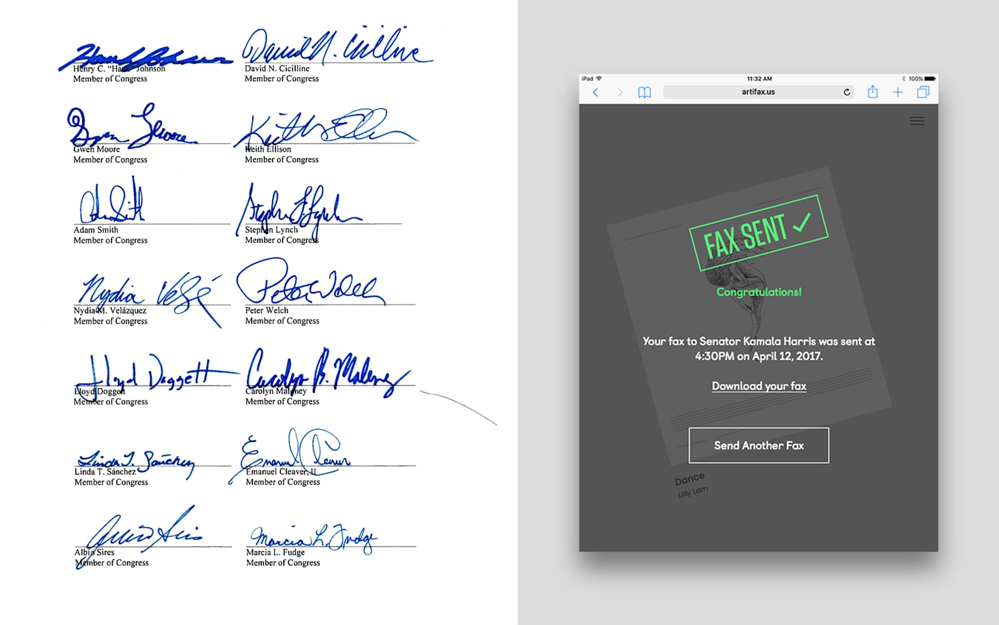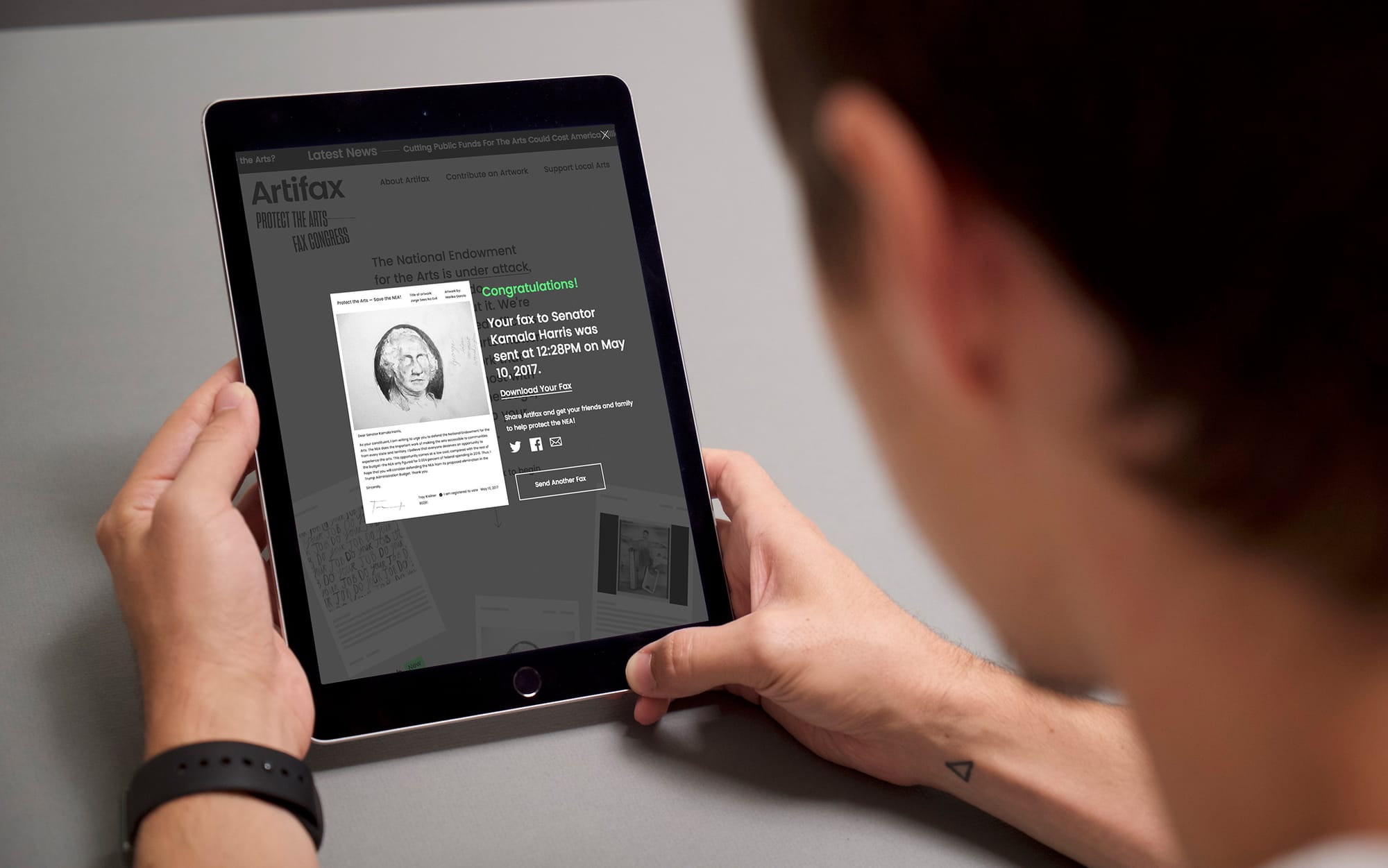 “We would love to see an image of a congressperson holding up a fax sent from the website and a comment on how it influenced their decision making. This would be a huge sign of success,” confesses Kreiner. Let’s help Artifax become the catalyst for political change.