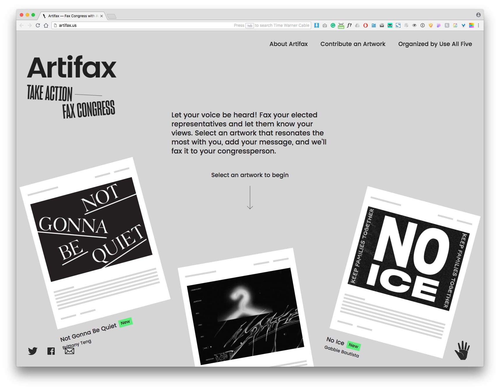 In Los Angeles, a design studio called Use All Five, founded by Levi Brooks and Jason Farrell, sought to fight against the NEA and NEH cuts in a way that would showcase the design industry. With the guidance of Use All Five Art Director Troy Kreiner, Brooks and Farrell launched Artifax, a website that uses original artwork as letterheads for messages to local representatives. Website visitors can select an artwork, enter their address, and choose the representative they want to reach out to about a given issue.