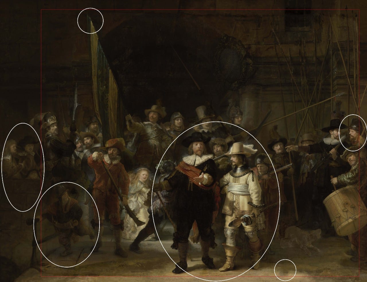 Highlights from the reconstruction reveal two more figures on the painting's left side: a militiaman and a young boy. The painting’s main figures, Captain Cocq and Lieutenant Willem van Ruytenburch, are now positioned to the right of the center instead of the middle of the canvas. The reconstruction also shows that the "powder boy" in the left foreground is holding onto a balustrade. With more space for movement in front of him, the boy now seems to be running away, ahead of the militia, according to the researchers. On the extreme right side of the canvas, the helmet worn by the militiaman is now complete. There is also more space on the top part of the painting, making the motion of raising the militia's flag "more convincing," the researchers say.