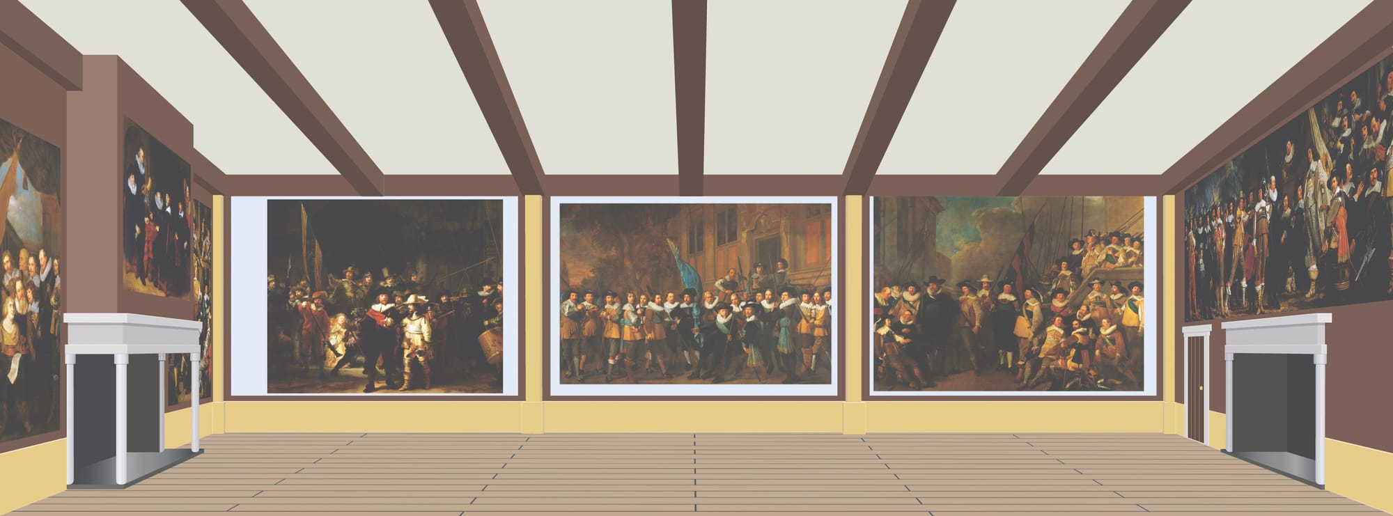 In 1639, Rembrandt was commissioned to make the painting for a new banqueting hall at the headquarters of the Kloveniers, the civic militia guards (or musketeers) of Amsterdam. The painting was part of a series of seven militia portraits (schuttersstukken), commissioned by Captain Banninck Cocq along with 17 members of his militia. In 1715, "The Night Watch" was moved to what was at the time Amsterdam’s City Hall, now the Royal Palace on Dam Square. Alas, the colossal painting was deemed too large for its new location, so it was trimmed from all four sides, with the largest section being removed from the left side. According to art historians, this was done in order to fit the painting between two columns, a common practice at the time. The trimmed pieces have never been found.