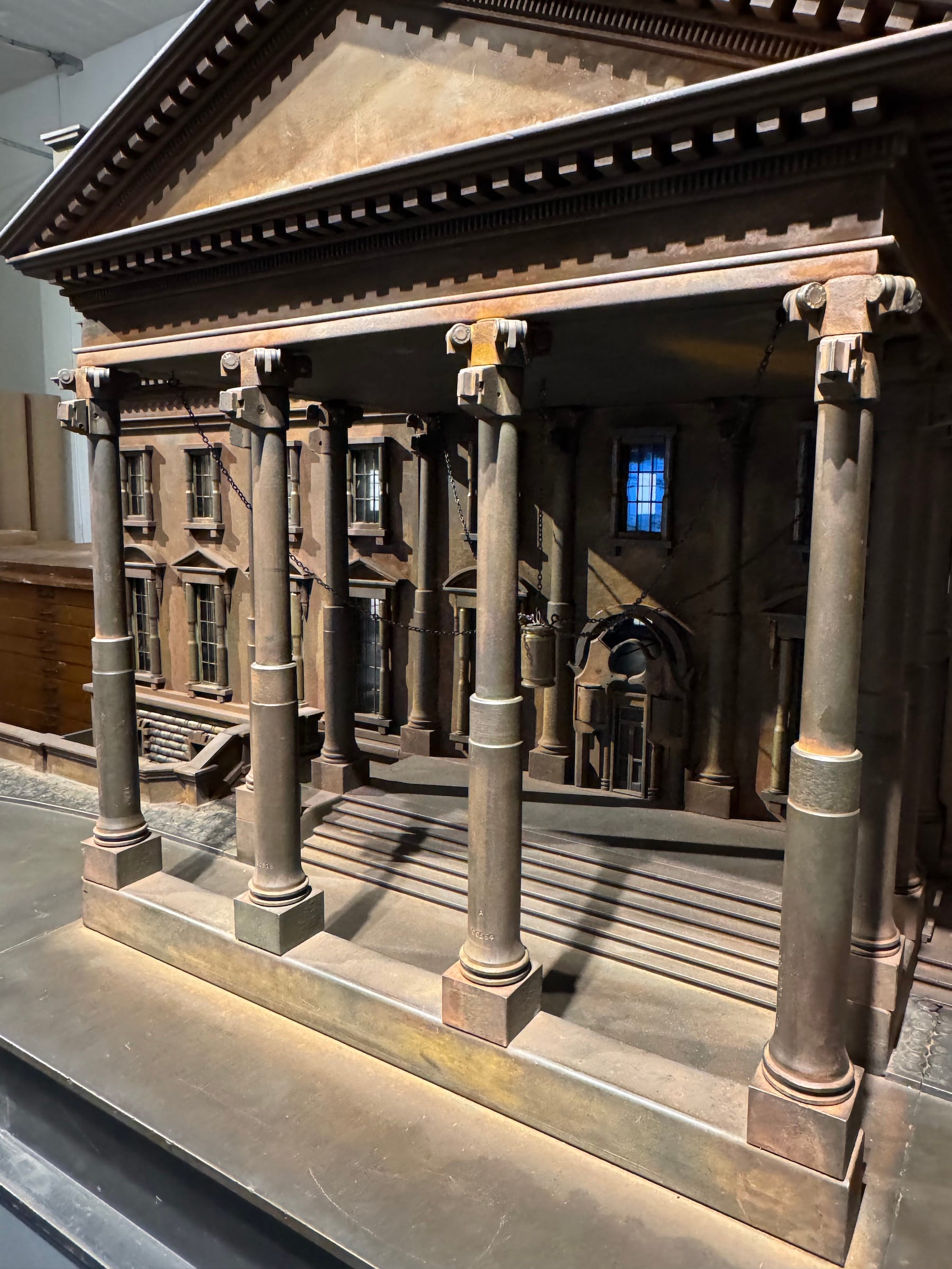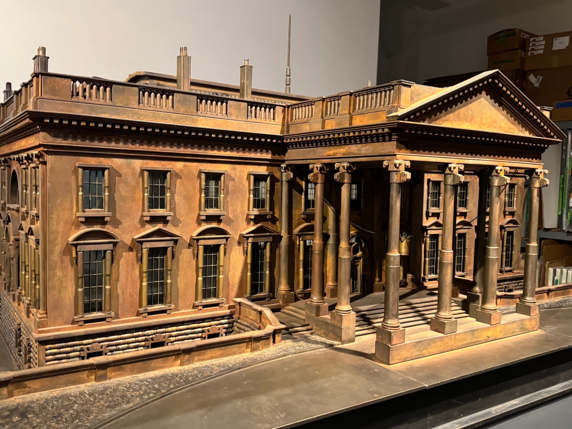 Originally, his model of the White House was painted black, but Farrow decided to chemically rust the model to make it appear "corroded."