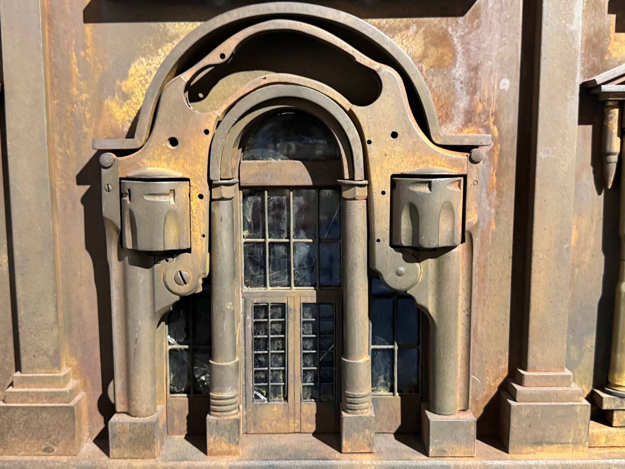 His first works featuring gun parts were inspired by Catholic reliquaries, containers for relics that were sometimes fashioned into the form of body parts to store remains of saints during the Middle Ages.
