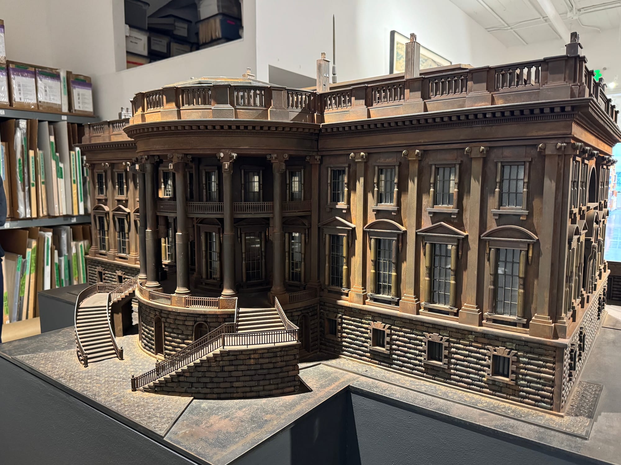 The recreation of the White House marks a thematic departure from many of Farrow's other sculptures, which include models of synagogues, mosques, and Christian churches comprised of munitions.