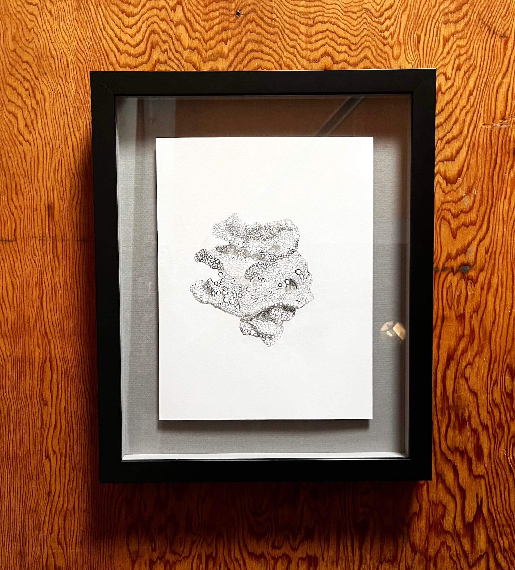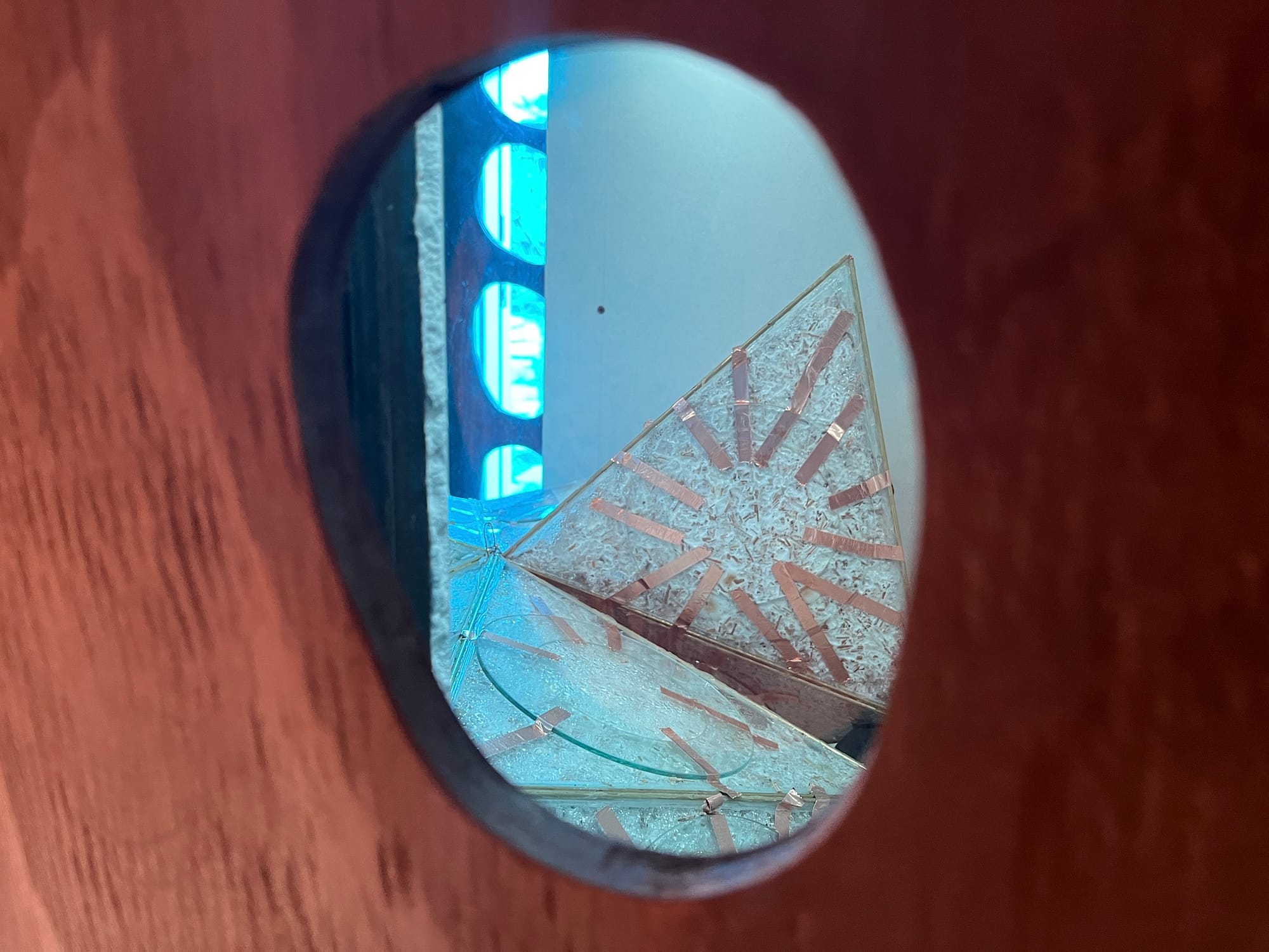 Inside the diminutive Lazy Eye Gallery, a cozy space made from a converted water tower, stands a little wooden chamber about six feet tall with amoeba-shaped openings that let in sunlight and allow, of course, for art-viewing. As mycelium needs relatively airtight and moist environments to thrive and avoid mold, tiny spores are carefully placed flat within glass trapezoidal glass panes fitted with metal-edged closures.
