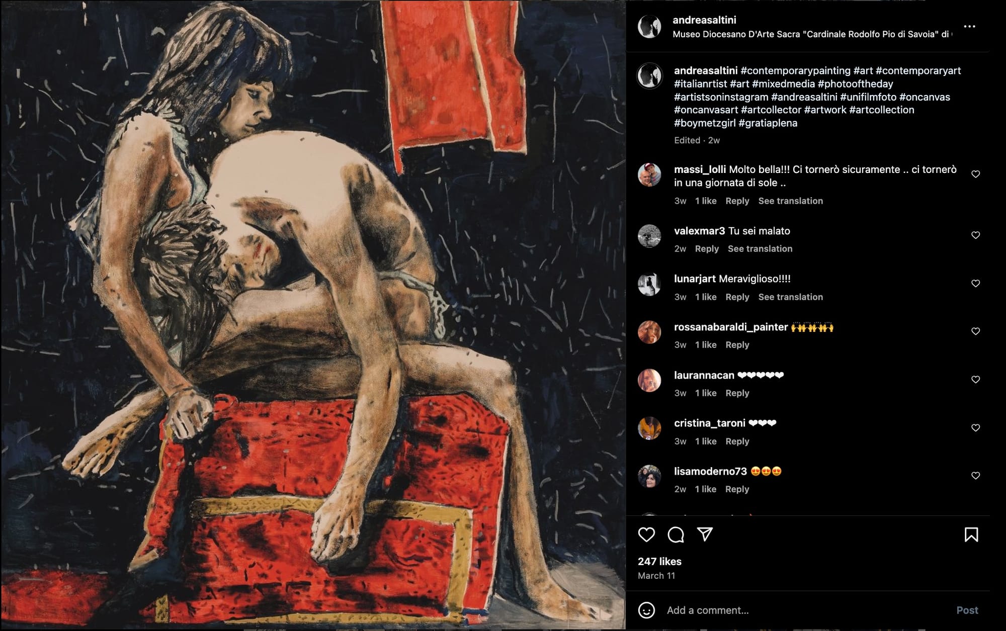 Conceived as the artist's personal reflections on and search for spirituality, the exhibition of some 20 new works opened at the museum for religious art on March 2 with a critical introduction and hundreds of visitors. The show immediately drew ire over various works that were deemed "sacrilegious" — including the painting of post-crucifixion Jesus apparently receiving fellatio entitled "INRI (San Longino)" (2024) as well as "Noli Me Tangere" (2024), depicting a nude Jesus collapsed face-forward on the lap of the naked Mary Magdalene, among other works.