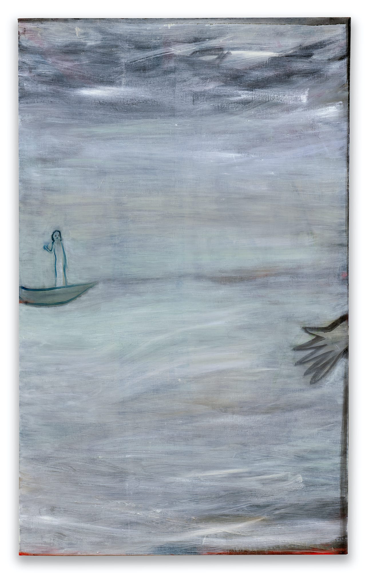 At the center of the exhibition are these last three works. Together, they can be read as a narrative sequence that turns back on itself in unexpected ways, moving episodically from dying and bidding farewell to cremation to floating up to a presumed paradise that we never see. Instead, “Ascending to Heaven” remains suspended in the air. The women who fill it resonate with the lone figure in "Bye Bye" who stands in a boat cropped by the painting’s left edge. She faces the viewer with her hand raised, bidding farewell. On the opposite side of the canvas is a larger hand extending downward, its fingers spread apart — a gesture of letting go. The resemblance of the hands is open to multiple interpretations, from the similarity of the gesture to the mother’s and daughter’s shared mortality to the act of seeing each other and themselves off.